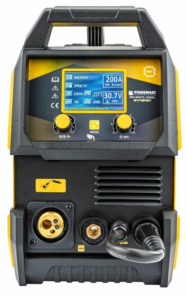 Aparatul de sudură cu invertor Migomat, 11,3 kVA | PM-IMGTS-200AL permite sudarea eficientă a diferitelor tipuri de grupe de materiale într-o gamă largă de grosimi de material. Tranzistoarele IGBT utilizate au un efect pozitiv asupra consumului redus de energie, a unei imunități mai mari la interferențe și căderi de tensiune și a unor proprietăți bune ale arcului. Panoul de control este acum și mai ușor de utilizat, iar operatorul are acces rapid la toate funcțiile. Acest lucru are un efect pozitiv asupra ergonomiei și a eficienței muncii în instalație.