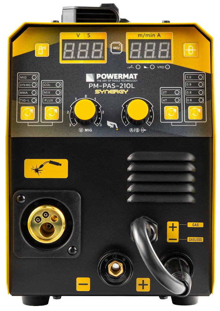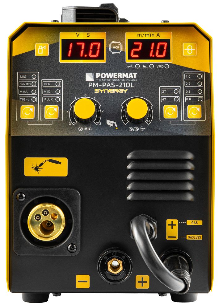 Aparatul de sudură cu invertor Migomat | PM-PAS-210L este un dispozitiv universal pentru sudarea MIG/MAG, FLUX, MMA și TIG LIFT, care își va dovedi eficiența în atelier și pe teren. Tehnologia IGBT și modul synergy facilitează selectarea parametrilor, datorită cărora obțineți un arc stabil și suduri repetate. Afișajul LCD, funcția puls și sistemul de răcire cresc controlul, precizia și siguranța lucrului. Modul Synergy selectează automat parametrii pentru material și gaz. Vă concentrați pe sudare, nu pe setări.