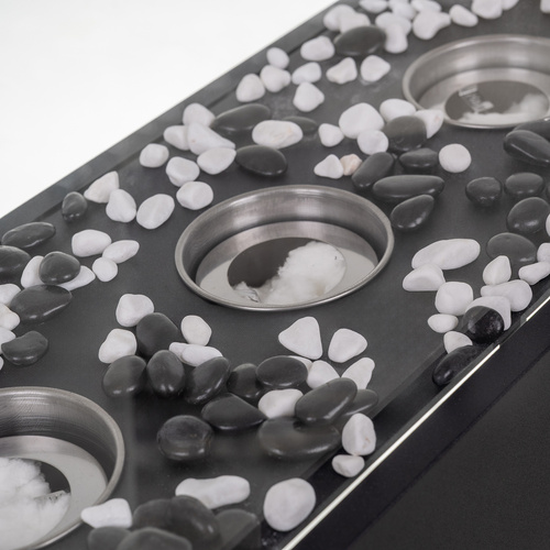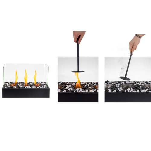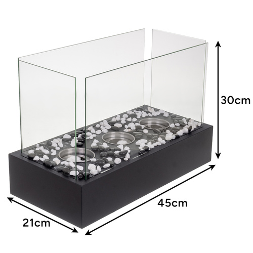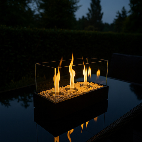 Bioșemineu + pietricele, 45x29x20.5cm | Kaminer este un bioșemineu portabil elegant, conceput pentru arderea confortabilă și ecologică a bioalcoolului în interior. Are 4 pereți de sticlă, datorită cărora focul este stabil și protejat de contactul accidental. Biocombustibilul special arde complet, fără fum și substanțe nocive, astfel încât vă puteți bucura de el în casa dumneavoastră. Șemineul nu numai că decorează interiorul, dar radiază și o căldură plăcută, ideală pentru serile răcoroase pe terasă sau în sufragerie.