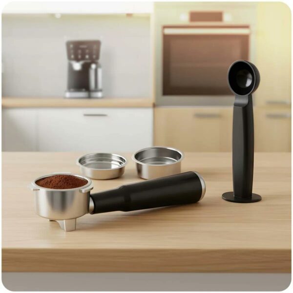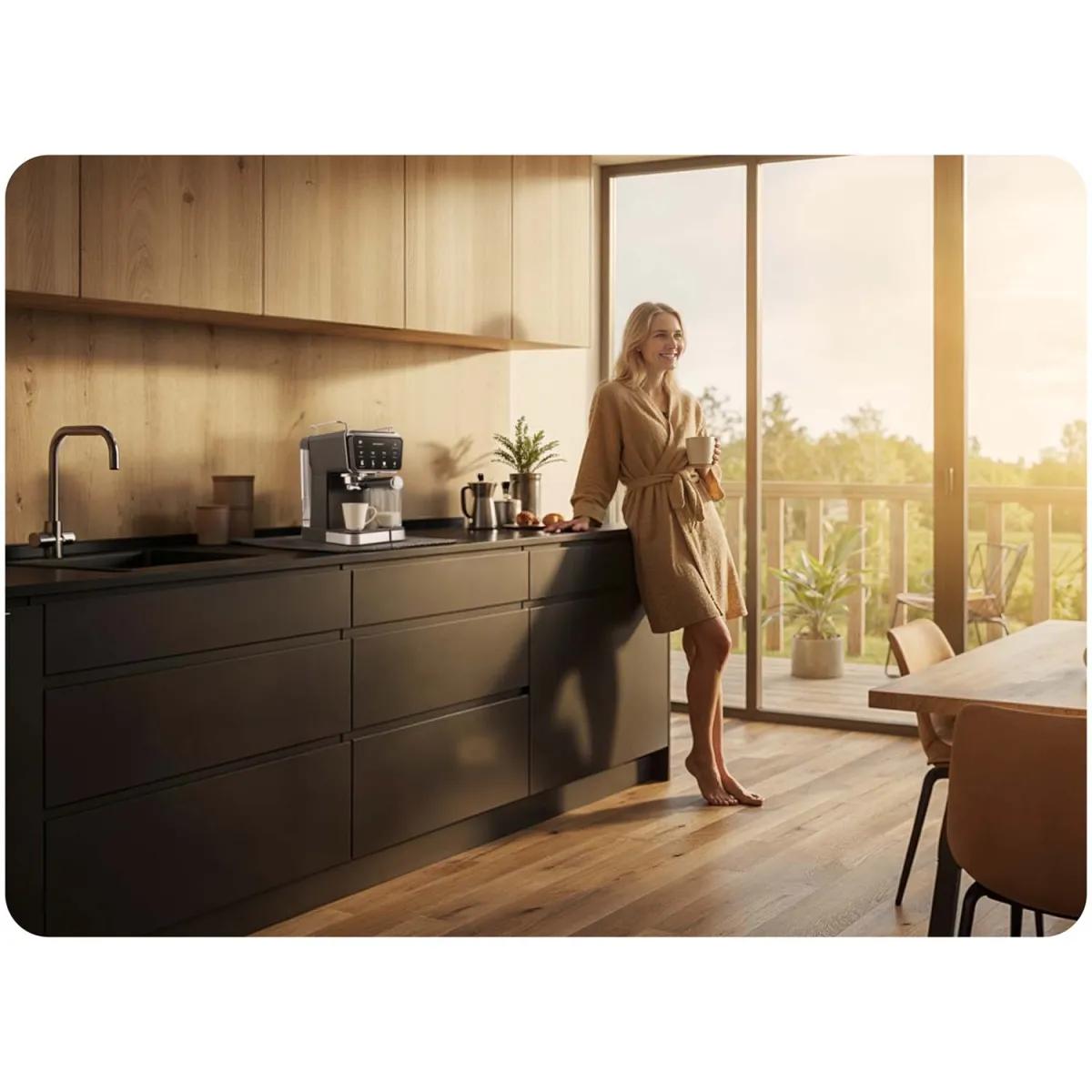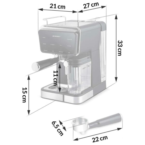 Dispozitivul include, de asemenea, un aburitor de lapte integrat, care vă permite să preparați cu ușurință cappuccino cremos, latte sau alte specialități din lapte. Cafetiera are un rezervor de apă detașabil cu o capacitate de aproximativ 1,5 litri, ceea ce vă permite să preparați mai multe cești fără a fi nevoie de reumplere constantă.
