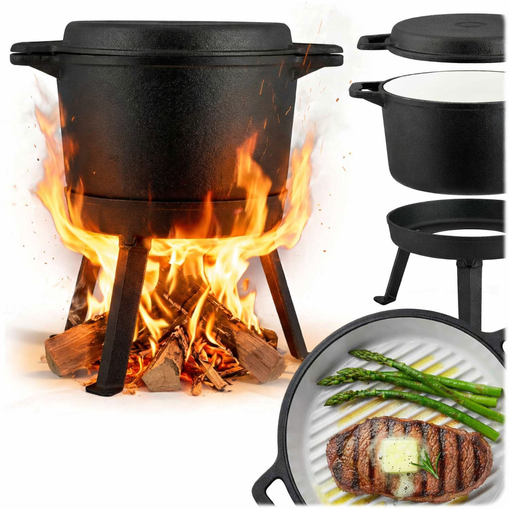 Ceainic din fontă cu tigaie 2 în 1 BD-480, 8L, emailat | Berdsen potrivit pentru prepararea meselor în aer liber, ideal pentru diverse forme de gătit pe foc și grătar. Construcția solidă din fontă cu o suprafață interioară emailată asigură o distribuție uniformă a căldurii și o reținere îndelungată a acesteia, ceea ce susține o gătire eficientă chiar și la prepararea unor mâncăruri mai pretențioase, în timp ce materialul rezistă la temperaturi ridicate și își păstrează forma chiar și în cazul utilizării pe termen lung.