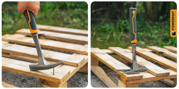 Pe de altă parte, partea de lucru din spate, în formă de pană, cu două vârfuri, permite îndepărtarea rapidă și ușoară a cuielor vechi, fără a deteriora materialul. Designul oferă un efect de levier ridicat, făcând îndepărtarea mai ușoară și mai puțin obositoare pentru utilizator și provocând mai puține daune lemnului.