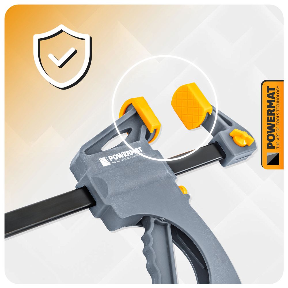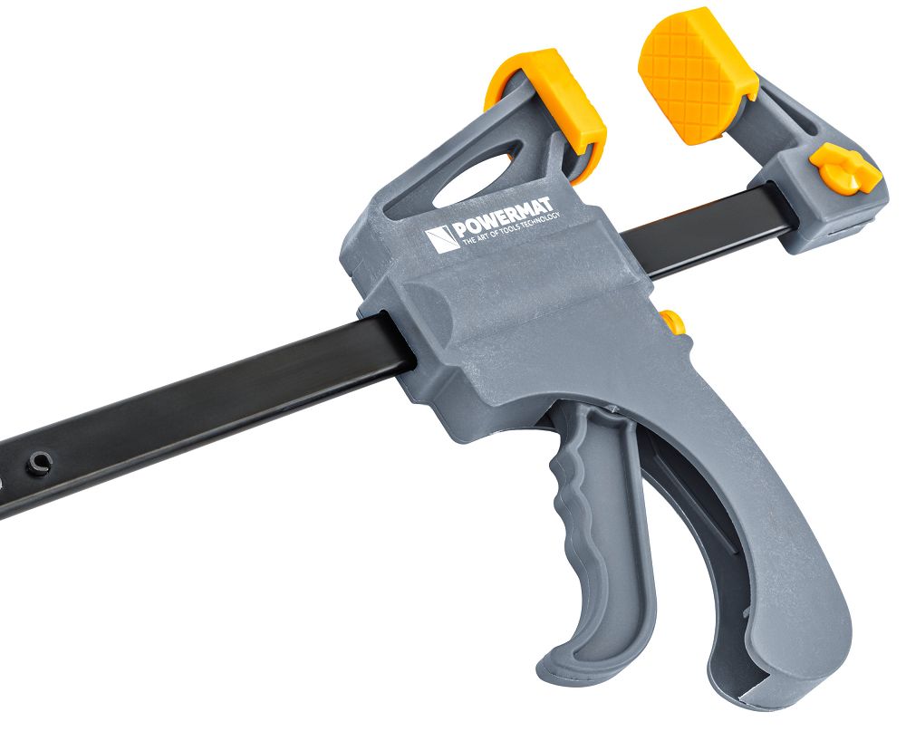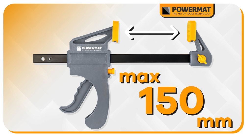 Clemă de tâmplar, 150x60mm | PM-SSD-6T poate fi utilizată ca clemă clasică și ca distanțier prin mutarea brațului în partea opusă. Acest lucru vă permite nu numai să comprimați elementele împreună, ci și să controlați expansiunea acestora, de exemplu, la asamblarea ramelor, a ramelor de uși sau a structurilor de dulapuri. Lungimea totală a clemei este de 34 cm, ceea ce oferă un echilibru bun între raza de lucru și manevrarea sculelor.