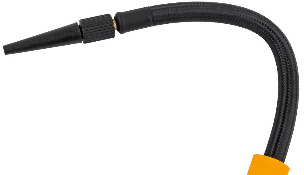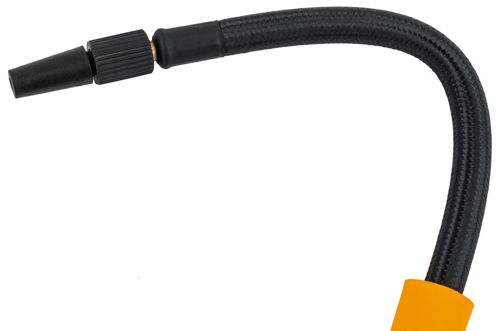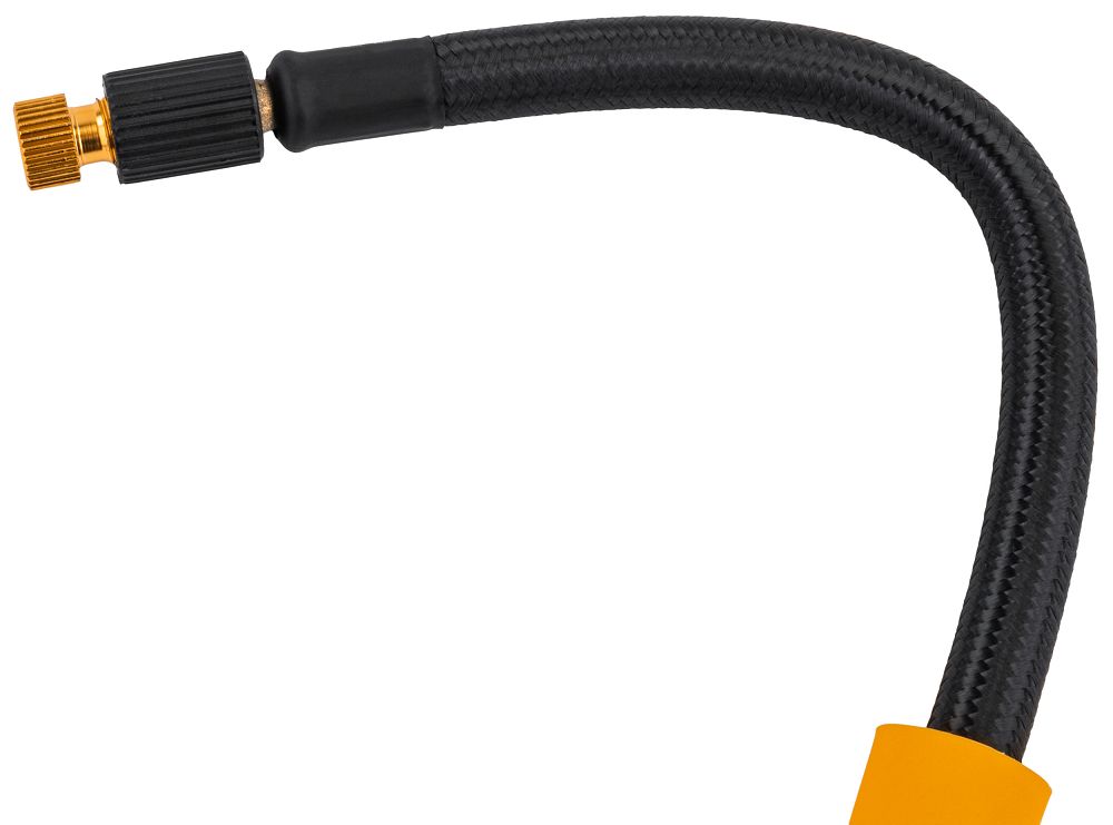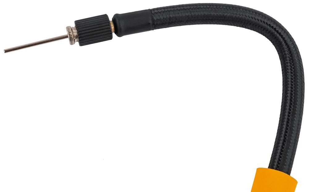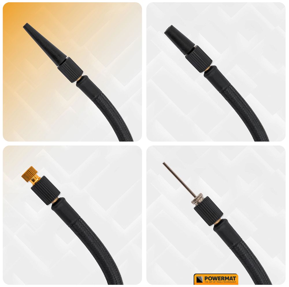 Compresorul este livrat cu un set de vârfuri interschimbabile, permițându-vă să adaptați cu precizie unealta la diferite tipuri de valve. Pompa are o valvă Schrader integrată, situată direct pe furtun, permițând conectarea rapidă și sigură la valvele auto standard. Acest lucru facilitează umflarea anvelopelor de mașină și motocicletă.