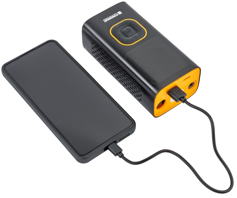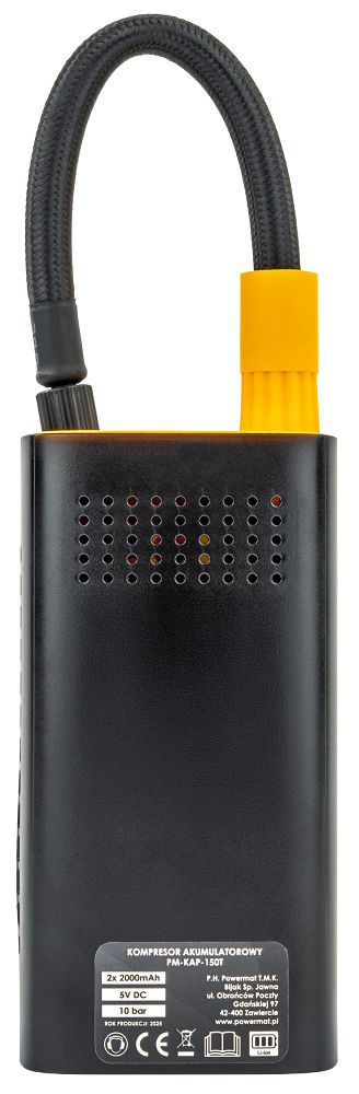 Compresorul auto, 80W | PM-KAP-150T este un dispozitiv portabil pentru umflarea rapidă a anvelopelor, mingilor sau a obiectelor gonflabile fără a fi nevoie de alimentare externă. Dispozitivul oferă o putere de 80 W și o presiune maximă de 10 bar / 150 PSI, ceea ce garantează umflarea rapidă și eficientă a diferitelor tipuri de anvelope și accesorii. Este echipat cu o baterie cu o capacitate de 4000 mAh (2×2000 mAh), ceea ce permite funcționarea mobilă fără a fi nevoie de conexiune constantă la sursa de alimentare.