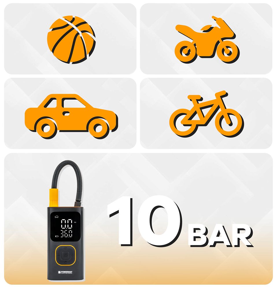 Compresorul este potrivit pentru umflarea anvelopelor autoturismelor, SUV-urilor, motocicletelor, bicicletelor și trotinetelor electrice, oferind în același timp parametri adaptați diferitelor tipuri de vehicule. De asemenea, funcționează perfect cu echipamente sportive și recreative, permițându-vă să umflați rapid mingi, saltele și accesorii gonflabile, ceea ce îl face un instrument universal pentru uz casnic și în călătorii.