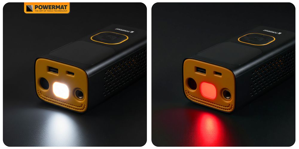 Este echipat cu un senzor de supraîncălzire și protecție împotriva presiunii incorecte și a încărcării incorecte, ceea ce protejează atât dispozitivul, cât și utilizatorul. Adaptarea la lucrul la temperaturi extreme crește fiabilitatea dispozitivului în atelier, pe drum și pe teren. Portul USB vă permite să utilizați dispozitivul ca baterie externă. Lampa LED oferă iluminare continuă, iluminare de urgență și moduri SOS, crescând semnificativ funcționalitatea compresorului în condiții de iluminare slabă.