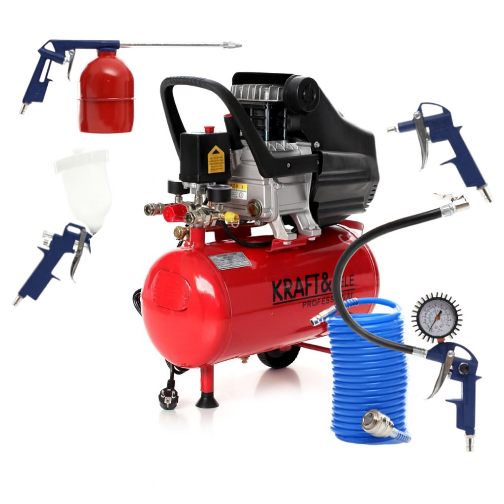 Compresorul de ulei cu accesorii, 24L | KD400-K3 este un dispozitiv universal, ideal pentru ateliere profesionale și pasionații de bricolaj. Compresorul este echipat cu un motor monocilindric puternic, cu o putere de 3,8 CP, care permite funcționarea eficientă cu majoritatea dispozitivelor pneumatice – pentru vopsire, curățare sau suflare.