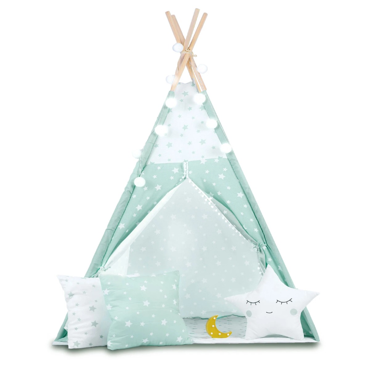Cort TeePee pentru copii – Stele | Menta – este o idee grozavă de cadou care va garanta distracție plăcută pentru toți membrii familiei. Tuturor copiilor le place să se ascundă, să construiască case și alte structuri în care are loc marea lor aventură. Livrăm gratuit 3 perne, lumini elegante și o husă de cort cu fiecare TIPI! Toate acestea vor diversifica suplimentar aspectul bazei noastre și îi vor oferi o atmosferă și mai bună.