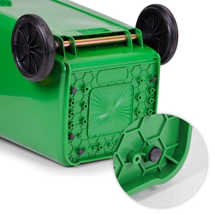 Coșul de gunoi din sticlă, 120L | verde, pe roți, este o soluție practică și mobilă pentru colectarea și mutarea deșeurilor în casă sau în aer liber. Este fabricat din plastic HDPE durabil, este rezistent la radiațiile UV, substanțe chimice și deteriorări mecanice, fiind potrivit pentru toate condițiile meteorologice. Capacul etanș protejează împotriva apei și a mirosurilor neplăcute, asigurând o utilizare igienică.