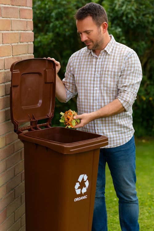 Coșul de gunoi pentru deșeuri BIO, 120L | maro pe roți este o soluție practică și mobilă pentru colectarea și mutarea deșeurilor în casă sau în aer liber. Este fabricat din plastic HDPE durabil, este rezistent la radiațiile UV, substanțe chimice și deteriorări mecanice, fiind potrivit pentru toate condițiile meteorologice. Capacul etanș protejează împotriva apei și a mirosurilor neplăcute, asigurând o utilizare igienică.