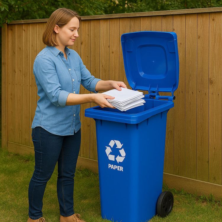Coșul de gunoi pentru hârtie, 120L | albastru, cu roți, este o soluție practică și mobilă pentru colectarea și mutarea deșeurilor în casă sau în aer liber. Este fabricat din plastic HDPE durabil, este rezistent la radiațiile UV, substanțe chimice și deteriorări mecanice, fiind potrivit pentru toate condițiile meteorologice. Capacul etanș protejează împotriva apei și a mirosurilor neplăcute, asigurând o utilizare igienică.