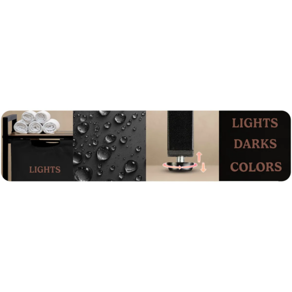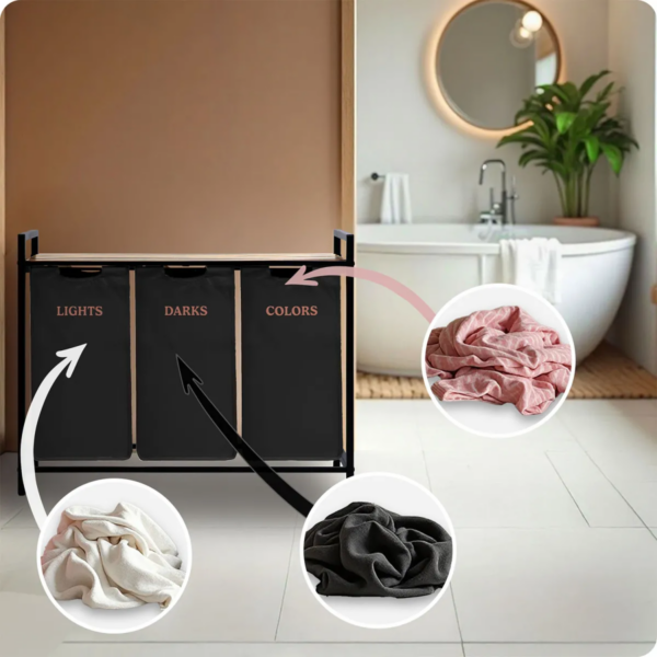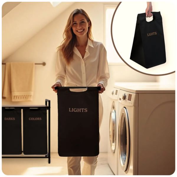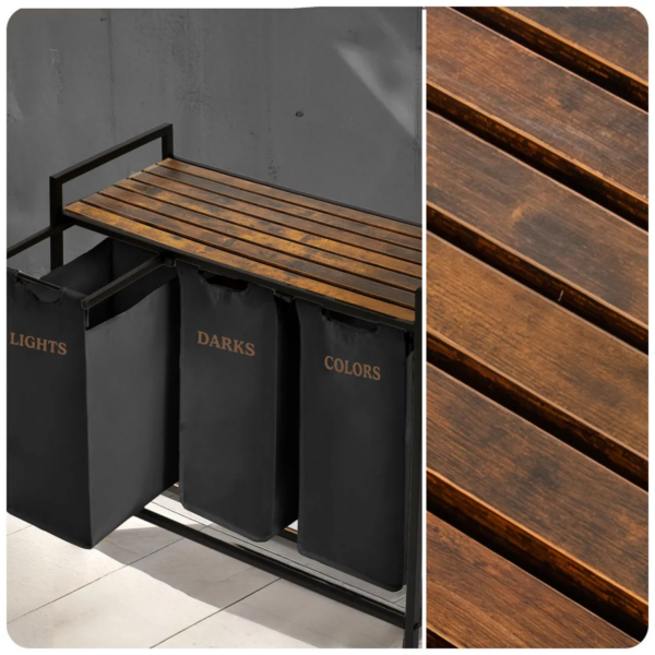 Datorită acestui sistem, economisiți timp la spălare și mențineți ordinea fără efort. Designul modern și minimalist, cu elemente din lemn și negru, se potrivește în majoritatea interioarelor – de la baie până la spălătorie. Sacul textil este detașabil, ușor de întreținut și, dacă este necesar, îl puteți scoate pur și simplu și îl puteți transfera în mașina de spălat. Construcția metalică stabilă asigură că coșul nu își pierde forma chiar și atunci când este complet încărcat.