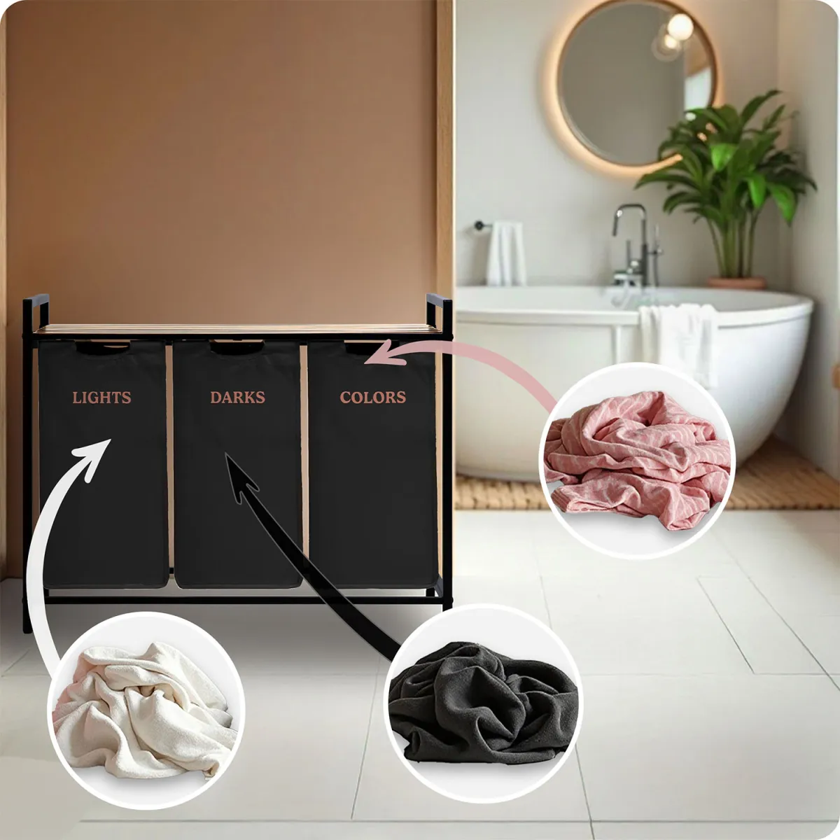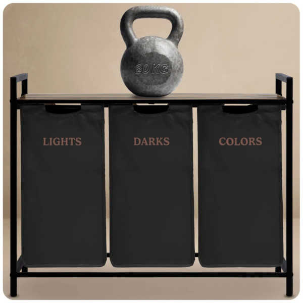 Coșul de rufe cu trei compartimente și cadru, 120L, negru | Massido oferă o soluție practică pentru sortarea rufelor acasă, într-un design modern. Construcția sa solidă combină un cadru metalic stabil cu un insert textil ușor, dar durabil, care este împărțit în trei compartimente separate – ideal pentru sortarea rufelor deschise la culoare, închise la culoare și colorate la încărcare.