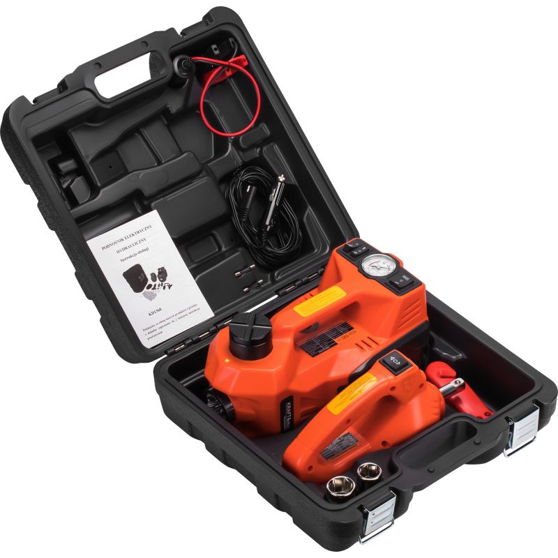 Cricul electric auto cu compresor | KD1368 vă permite să ridicați rapid și ușor vehiculul atunci când schimbați roți sau efectuați lucrări de service. Este un kit auto complet care combină un cric hidraulic electric, o lanternă, un manometru, o cheie automată pentru roți și un compresor încorporat. Este soluția ideală pentru șoferii care doresc să fie pregătiți pentru orice situație pe drum – de la schimbarea unei roți la reparații minore.