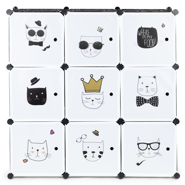 Fiecare dintre cele 9 rafturi poate susține până la 3 kg, astfel încât vă permite să depozitați cărți, jucării de pluș și seturi de construcție, iar datorită accesului facil, copiii își pot păstra singuri ordinea. Dulapul are uși ușor de deschis, cu grafică colorată cu personaje de basm, animale sau alte motive care vor înviora camera copiilor. Asamblarea este ușoară datorită conectorilor realizați din material ABS durabil și puteți ajusta configurația după cum este necesar.