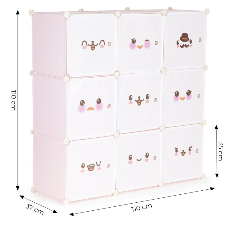 Fiecare dintre cele 9 rafturi poate susține până la 3 kg, astfel încât vă permite să depozitați cărți, jucării de pluș și seturi de construcție, iar datorită accesului facil, copiii își pot păstra singuri ordinea. Dulapul are uși ușor de deschis, cu grafică colorată cu personaje de basm, animale sau alte motive care vor înviora camera copiilor. Asamblarea este ușoară datorită conectorilor realizați din material ABS durabil și puteți ajusta configurația după cum este necesar.