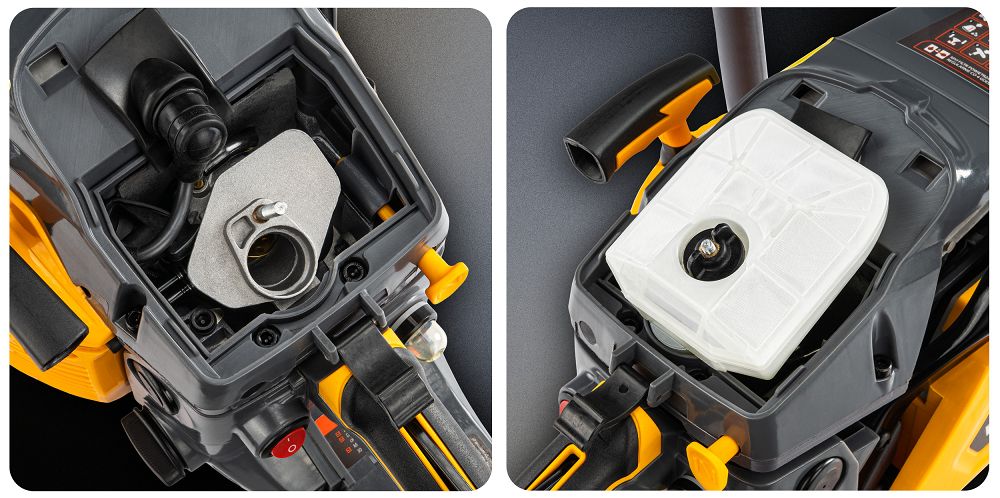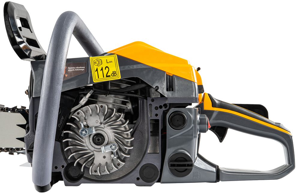 Pompa de combustibil (amorsare) și sistemul de pornire ușoară fac pornirea dispozitivului mai rapidă, mai ales cu motorul rece. Sistemul antivibrații cu 6 arcuri reduce vibrațiile chiar și în timpul lucrului intens, astfel încât mâinile obosesc mai puțin și aveți un control mai bun asupra drujbei. Mânerul antiderapant crește stabilitatea în timpul lucrului mai lung și siguranța la tăiere. Tratamentul Nikasil al cilindrului și pistonului crește rezistența la uzură și prelungește durata de viață a motorului.