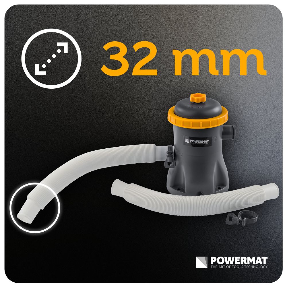 Puterea de 16 W este suficientă pentru o filtrare eficientă cu un consum redus de energie. Obțineți apă curată fără a vă face griji cu privire la costurile de operare ridicate. Capacitatea de 1250 l/h înseamnă o filtrare eficientă fără a supraîncărca sistemul. Apa circulă uniform, iar filtrul funcționează stabil chiar și cu utilizare regulată. Îl conectați la 230 V / 50 Hz și îl conectați folosind un conector de 32 mm, care este standard în instalațiile tipice de piscină.