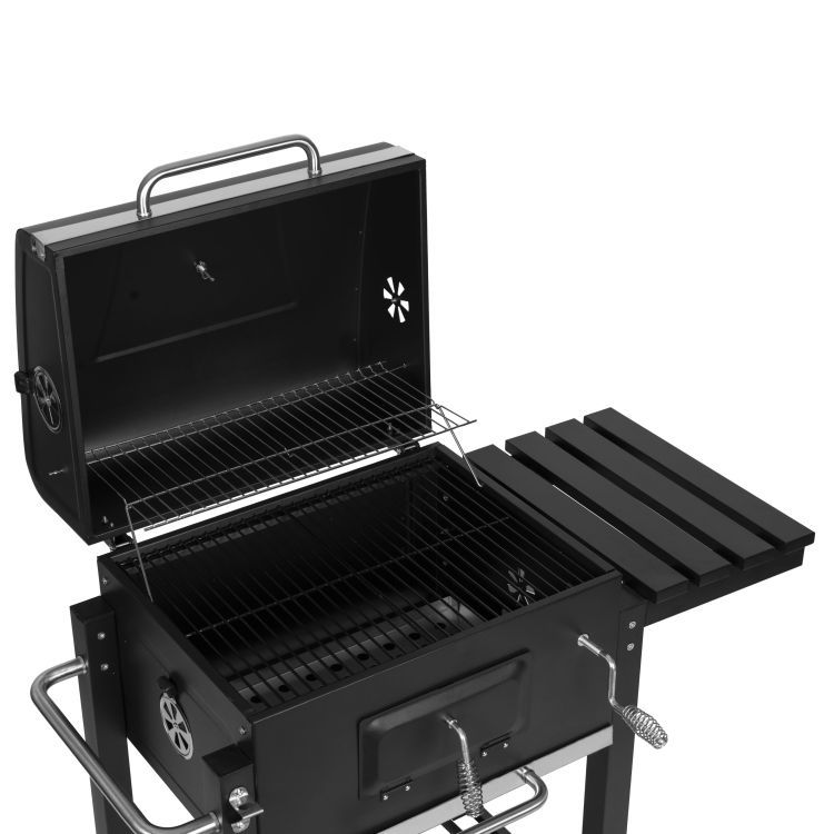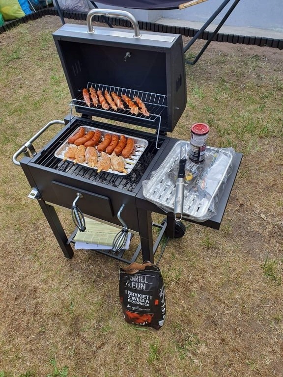 Grătar de grădină cu cărbune și capac | 112,5x104x65cm, datorită caracteristicilor și construcției sale, este ideal pentru petreceri în grădină și grătare în familie. Este echipat cu un capac cu termometru care permite controlul precis al temperaturii. Grătarul din oțel inoxidabil este rezistent la temperaturi ridicate. Grătarul are rafturi laterale și inferioare mari, care facilitează depozitarea accesoriilor și a cărbunelui.
