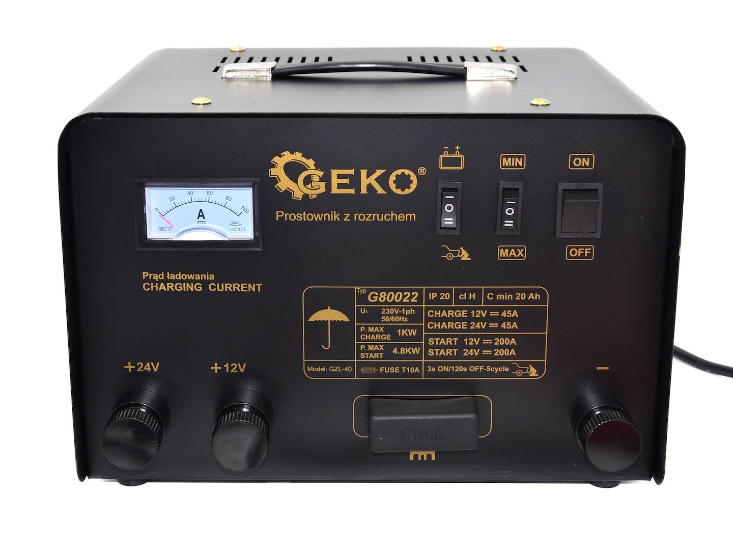 Încărcător auto cu demaror, 200A, 12/24V | GEKO permite reîncărcarea și pornirea de la distanță a bateriilor din autoturisme și camioane. Este conceput pentru a ajuta la pornirea și încărcarea bateriilor cu plumb de 12 V sau 24 V – baterii cu o tensiune de 12 V sau 24 V, utilizate, printre altele, în camioane și utilaje de construcții, precum și pentru pornirea motoarelor cu ardere internă în cazul unei descărcări complete a bateriei sau a unor temperaturi ambientale foarte scăzute.