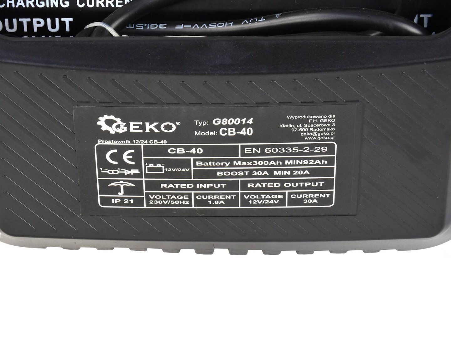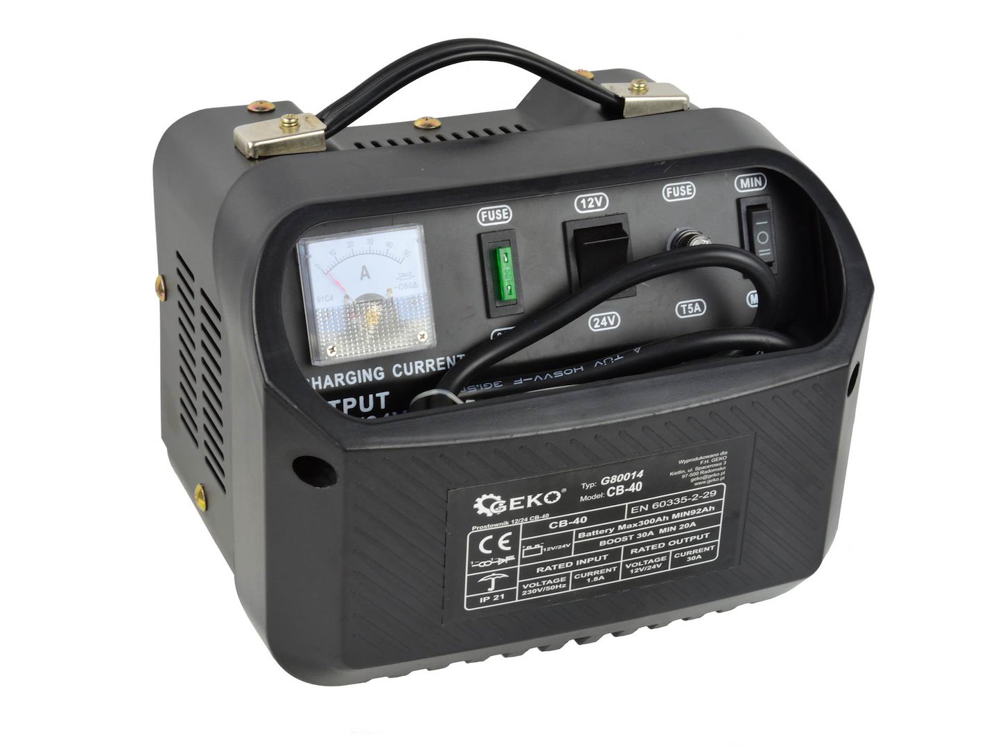 Încărcătorul de baterie auto, 12/24V, CB-40 | GEKO oferă o putere de pornire fiabilă pentru mașini și vehicule comerciale. Este conceput pentru a încărca baterii cu plumb (STD) cu o tensiune de 12 V sau 24 V, utilizate în autoturisme, autoutilitare, camioane etc. Are o siguranță încorporată care protejează dispozitivul împotriva conexiunii incorecte de polaritate și a scurtcircuitelor.