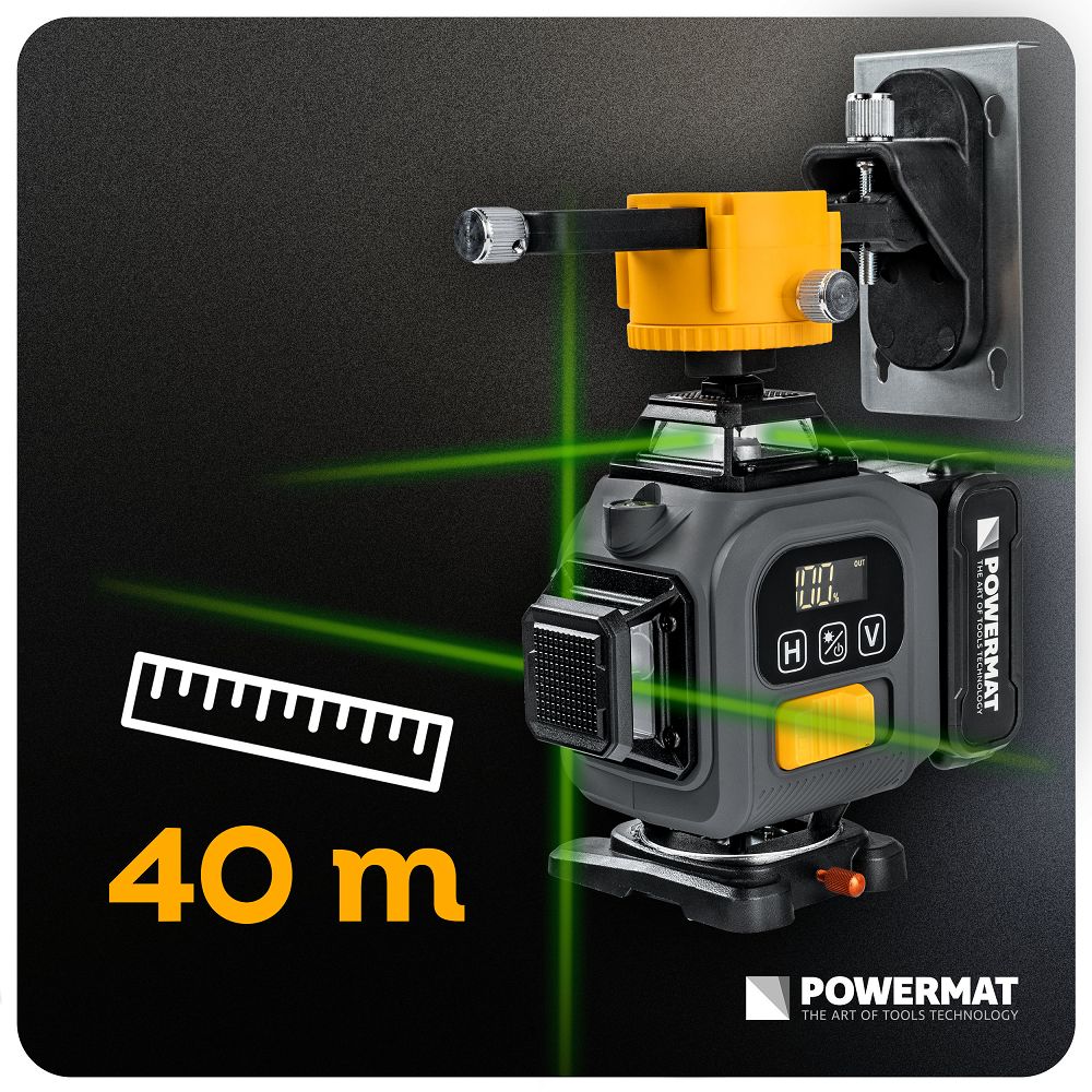 Laserul verde de înaltă vizibilitate și carcasa IP54 vă permit să lucrați în interior și în exterior. Bateria Li-Ion asigură o funcționare stabilă, fără întreruperi frecvente. Precizia de ±1 mm la 10 metri vă permite să mențineți linii drepte chiar și la distanțe mai mari. Raza de acțiune de până la 40 de metri vă permite să lucrați în încăperi mai mari și spații deschise. Ecranul LCD de pe panoul de control arată nivelul actual de încărcare a bateriei, astfel încât să știți cât timp de funcționare mai aveți.
