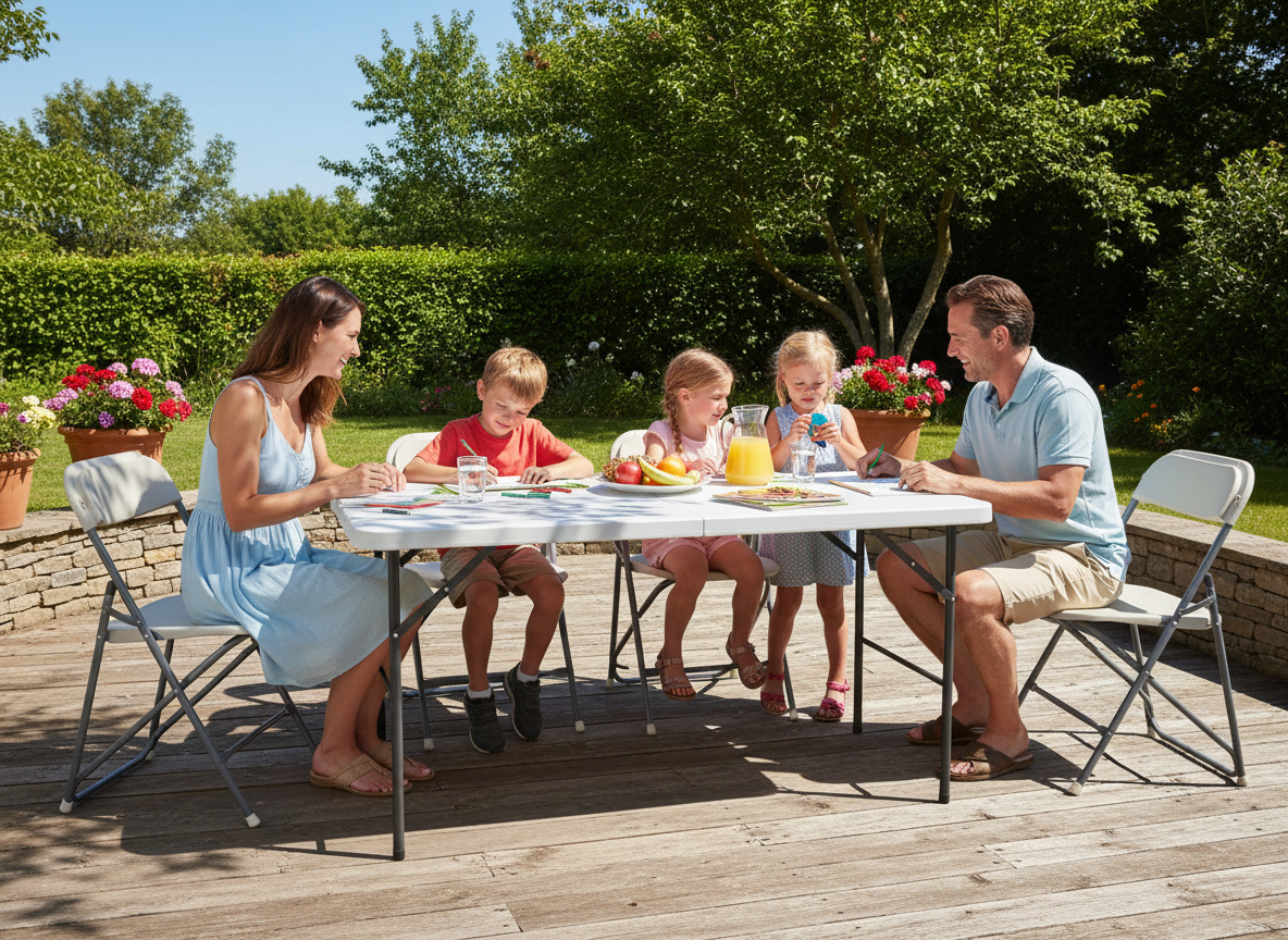 Masă turistică pliabilă, albă, 120x60x74cm | Garden Line oferă o suprafață practică și ușor de transportat pentru diverse utilizări în interior și exterior. Această masă practică și ușoară este soluția ideală pentru oricine apreciază confortul, mobilitatea și estetica. Datorită construcției sale stabile și blatului gros din plastic HDPE, masa este potrivită atât pentru interior, cât și pentru exterior. Poate găzdui până la 6 persoane și poate fi pliată și depozitată cu ușurință după eveniment.