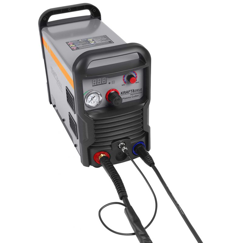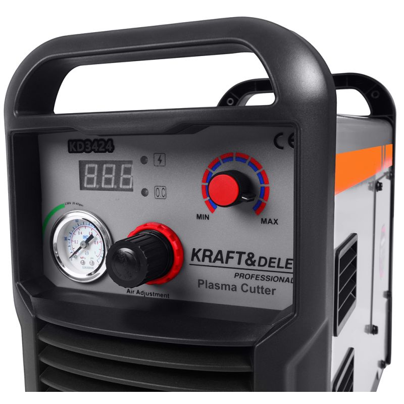 Pe panoul frontal al dispozitivului există un afișaj clar și comenzi care permit controlul complet asupra parametrilor de funcționare. Manometrul încorporat permite monitorizarea continuă a presiunii aerului, în timp ce butonul de control al aerului permite reglarea precisă a acesteia. Un buton suplimentar de control al curentului de tăiere vă permite să reglați puterea în funcție de tipul și grosimea materialului.