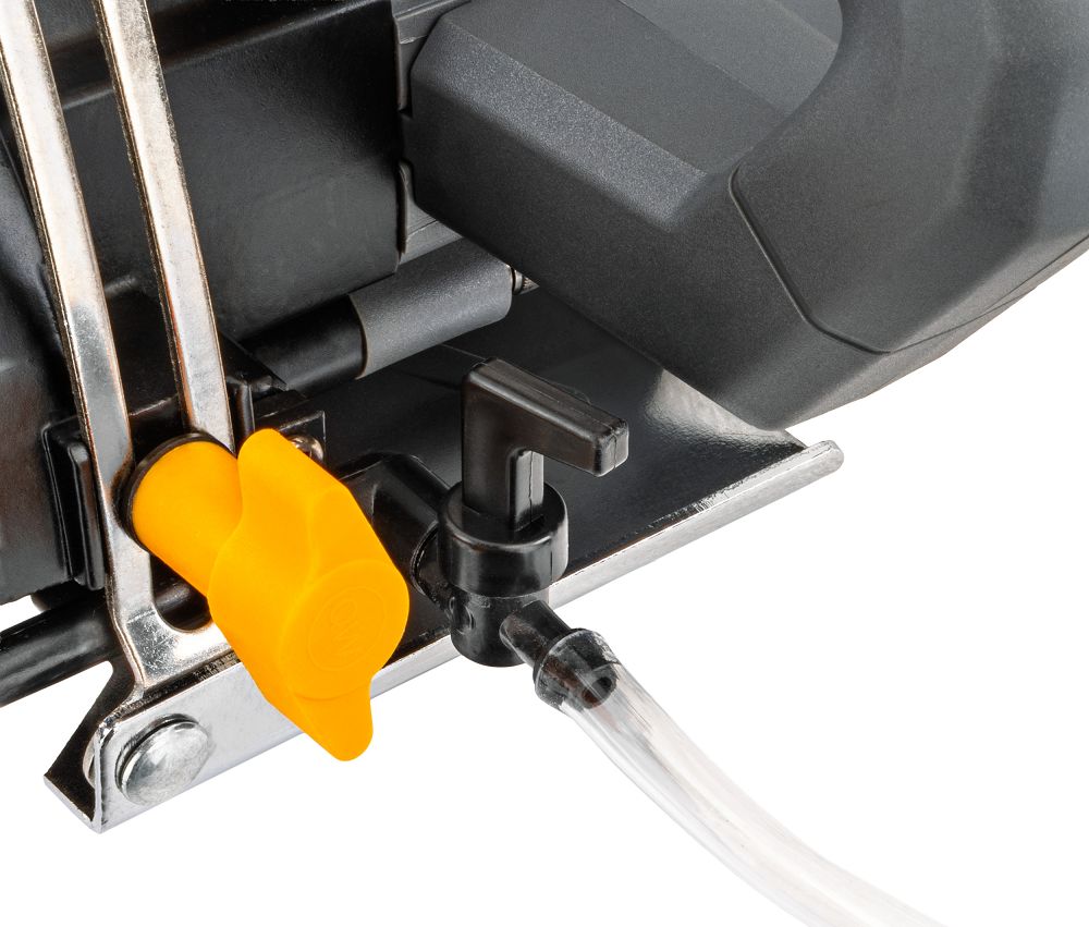 Freza oferă funcționalitate completă atât în modul de tăiere umedă, cât și uscată, permițându-vă să alegeți metoda de lucru ideală pentru tipul de material. Sistemul de răcire cu apă reduce riscul de supraîncălzire a lamei, limitează praful și îmbunătățește condițiile de lucru, asigurând tăieturi netede și curate chiar și în timpul utilizării pe termen lung. Capul de tăiere și capacul de protecție sunt fabricate din fontă groasă, iar placa de bază solidă din oțel garantează o rezistență ridicată la deteriorare și deformare.