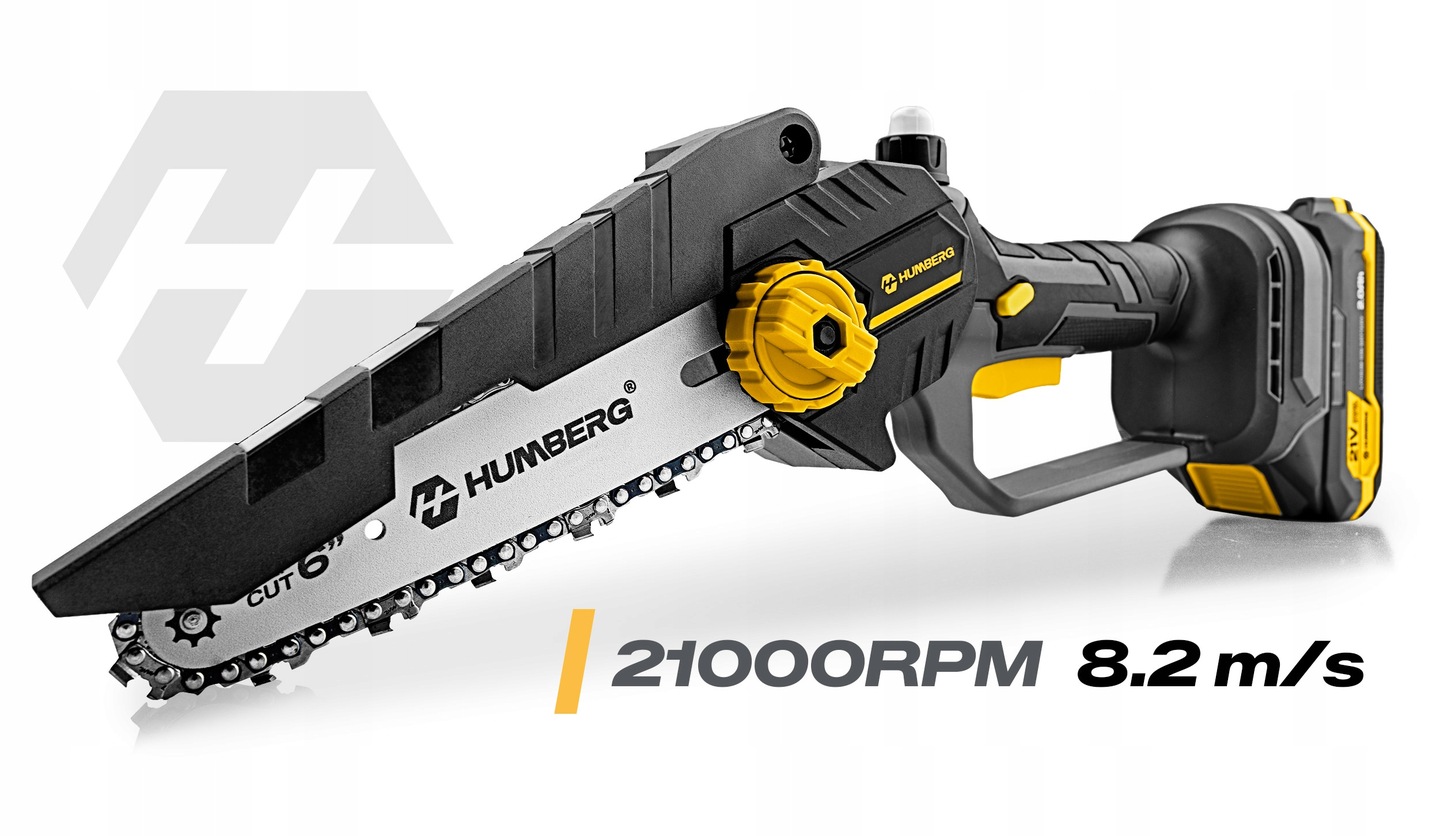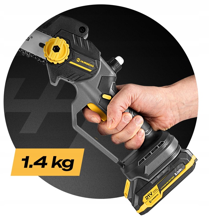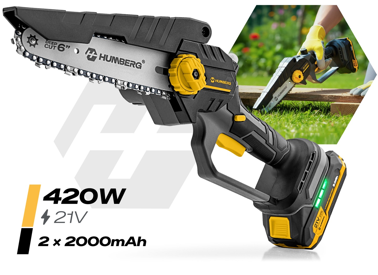Mini drujbă cu baterie HM-421, 420W | Humberg este o unealtă practică și mobilă pentru tăierea ușoară a lemnului și întreținerea grădinii fără cabluri. Datorită designului său ușor și echilibrat, este confortabil de ținut și controlat chiar și în timpul lucrărilor mai lungi, ceea ce îl face o soluție ideală pentru utilizarea acasă, fără a fi nevoie de acces la o priză de curent. Acționarea cu baterie oferă mobilitate și flexibilitate, în timp ce caracteristicile de siguranță sporesc siguranța la locul de muncă.