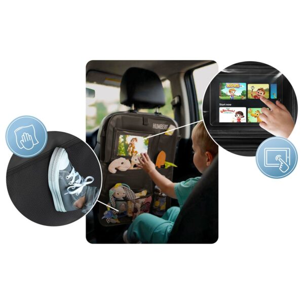 Organizator auto cu masă HM-993, negru | Humberg oferă spații practice de depozitare, ideale pentru călătorii lungi cu mașina cu copii sau călătorii de afaceri. Organizatorul este montat pe spătarul scaunului din față și oferă un spațiu amplu de depozitare sub forma mai multor buzunare, compartimente și suporturi din plasă pentru băuturi, cărți, jucării, încărcătoare și alte obiecte mici.