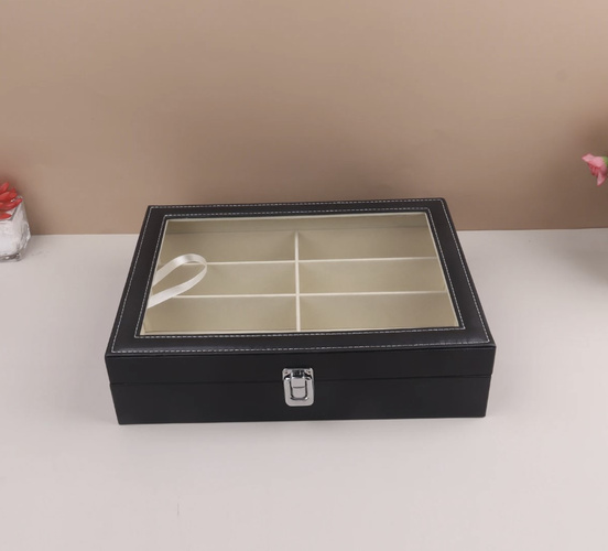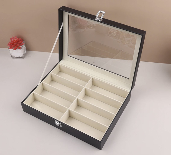 Organizator ochelari, 8 compartimente, negru | Soulima este o cutie practică de depozitare care vă va proteja ochelarii de zgârieturi și deteriorări. Husa este fabricată din piele artificială la exterior și are o căptușeală de flanel la interior, având și o închidere care previne deschiderea accidentală. Suportul pentru ochelari este o opțiune mai decorativă, care vă permite să vă expuneți colecția de ochelari și să aveți acces facil la ea.