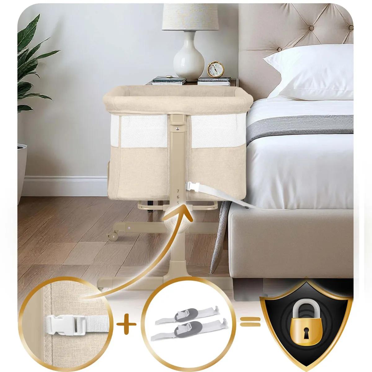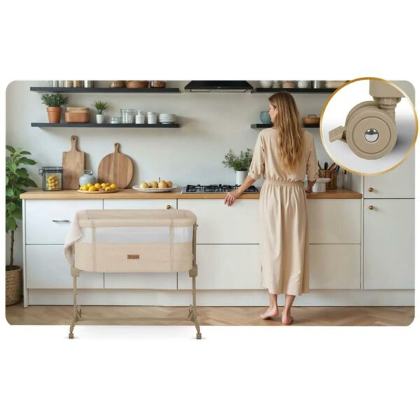 Construcția stabilă asigură siguranța, în timp ce cele 4 roți cu frâne permit o mișcare fără efort. Accesul lateral este detașabil și blocabil, astfel încât copilul să nu poată ieși singur, iar husele și părțile din material textil sunt detașabile și lavabile, ceea ce facilitează întreținerea. Pachetul include și o saltea cu husă detașabilă, care asigură confortul copilului.