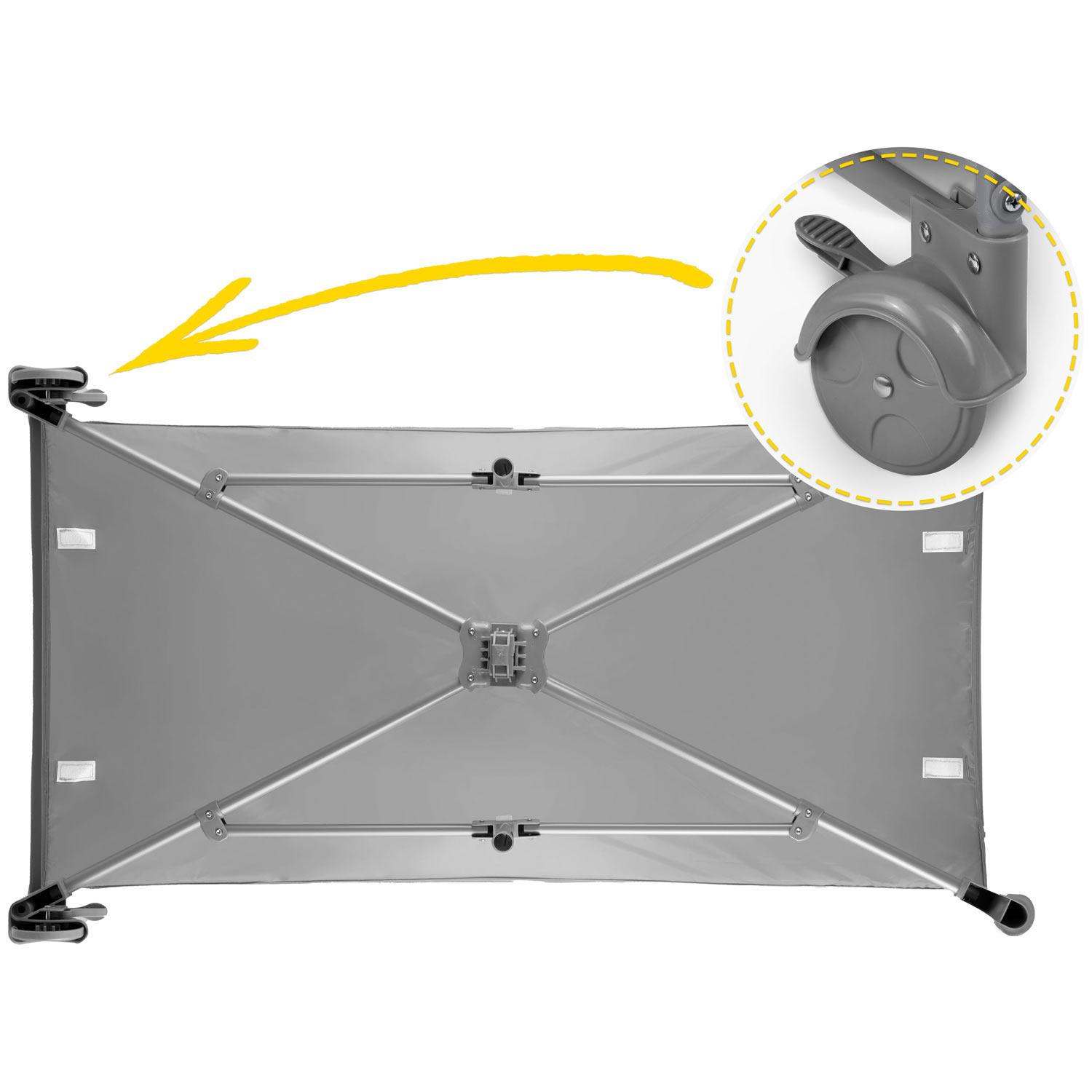 Intrarea laterală detașabilă nu poate fi depășită de copiii mici datorită încuietorii cusute la exterior. Cu toate acestea, permite copiilor mai mari și mai mobili să intre și să iasă din pătuț independent, confortabil și în siguranță, astfel încât nu vor încerca să se urce peste marginea superioară. Modul în care este cusută plasa previne tensiunea excesivă și îi crește durabilitatea. Roțile vă permit să mutați pătuțul dintr-un loc în altul fără probleme. Odată fixat, puteți bloca roțile pentru a menține pătuțul în siguranță.