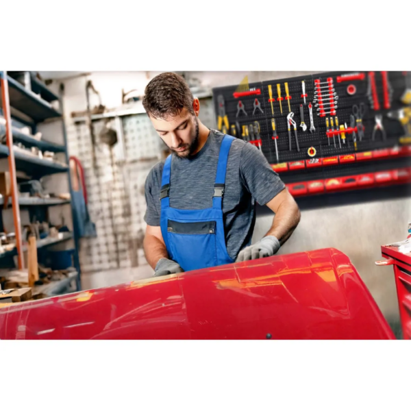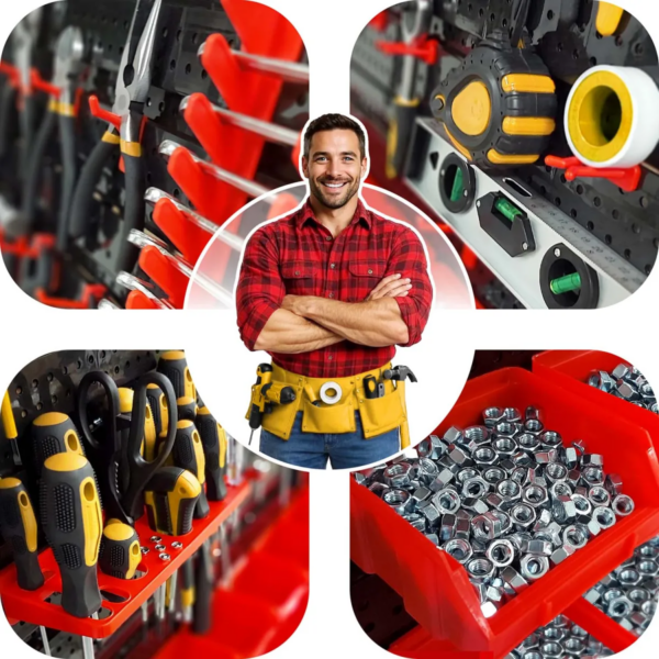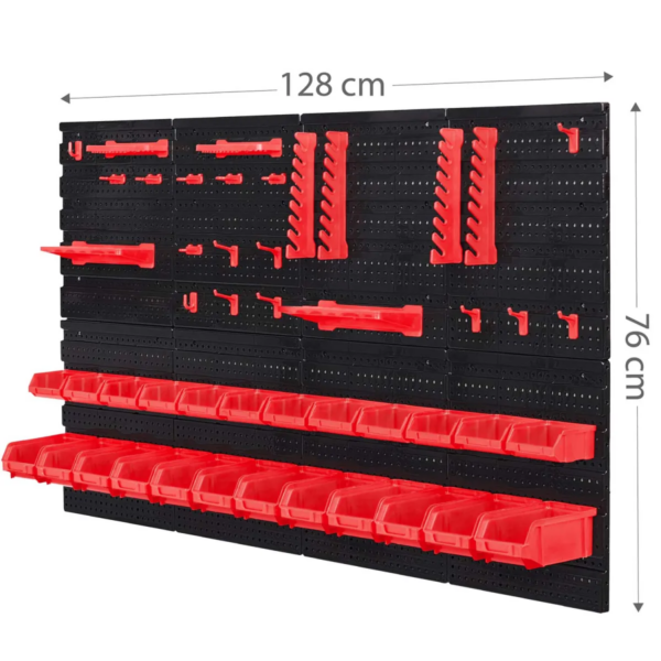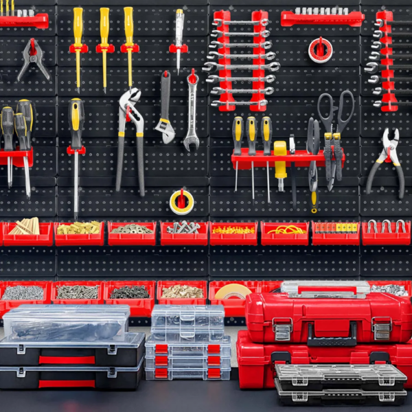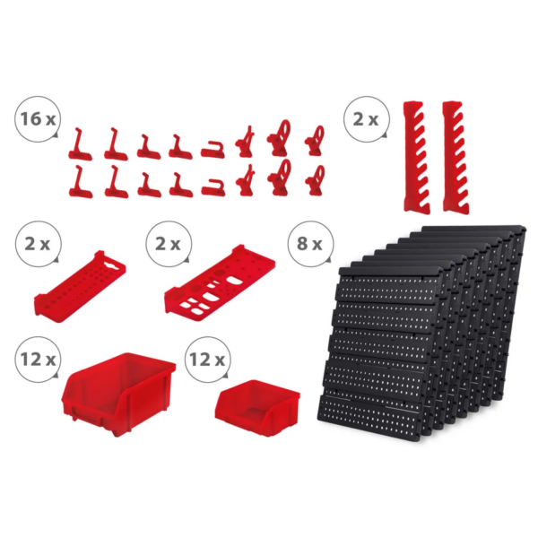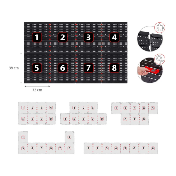 Panoul este format din 6 piese modulare care se conectează într-o singură suprafață. Producătorul a ales materiale punând accent pe durabilitate – componentele din plastic durabil completează baza robustă a panoului. Datorită acestui produs, puteți utiliza eficient peretele pentru a organiza șuruburi, scule, chei și piese mai mari, în timp ce fiecare piesă de sculă are propriul loc fix și este întotdeauna la îndemână.