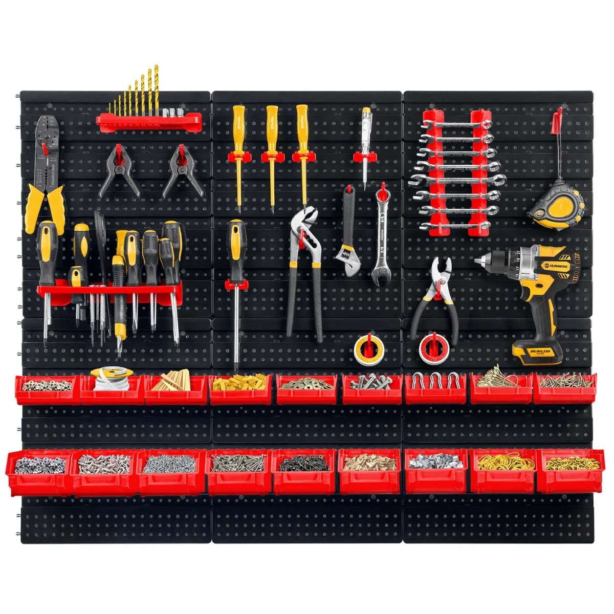 Peretele de atelier pentru scule HM-581, 96x76cm | Humberg este un panou organizatoric practic care vă va ajuta să vă mențineți atelierul ordonat. Setul include până la 43 de accesorii (cuve, cârlige, rafturi, suporturi), pe care utilizatorul le poate amplasa liber în funcție de propriile nevoi, ceea ce permite un design complet, personalizat al spațiului de lucru.