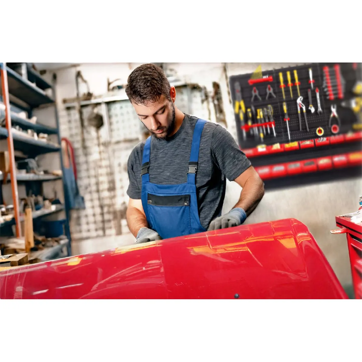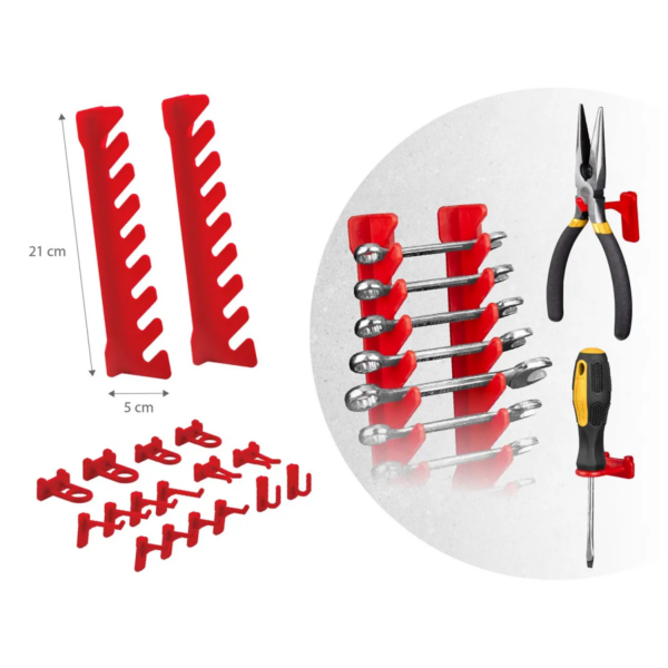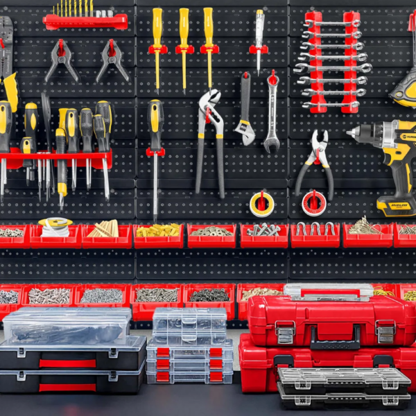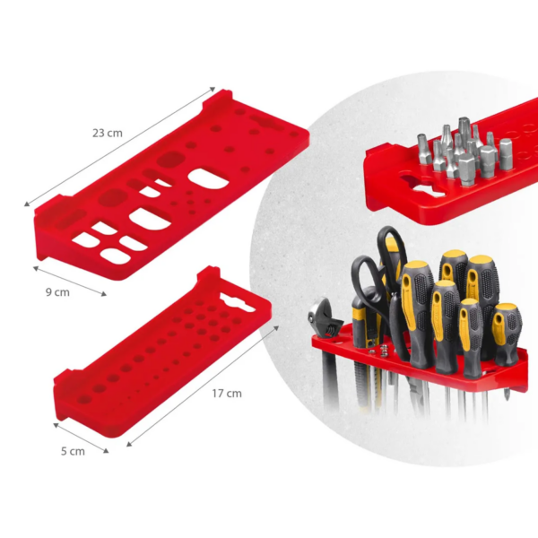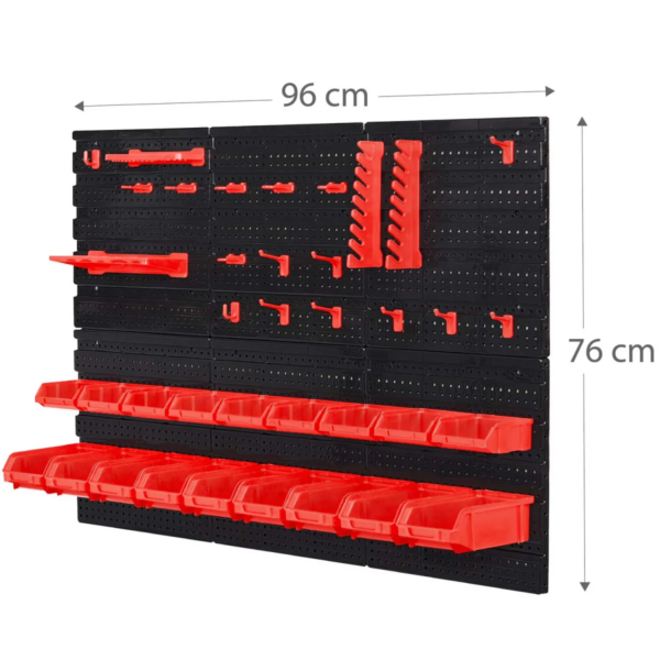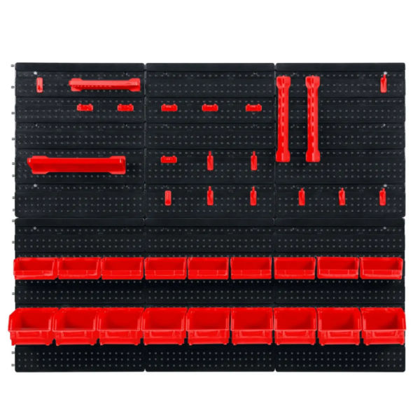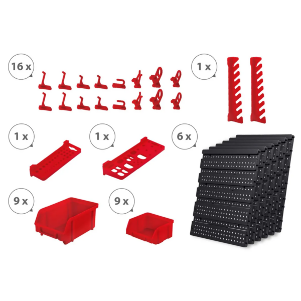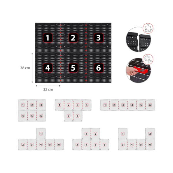 Panoul este format din 6 piese modulare care se conectează într-o singură suprafață. Producătorul a ales materiale punând accent pe durabilitate – componentele din plastic durabil completează baza robustă a panoului. Datorită acestui produs, puteți utiliza eficient peretele pentru a organiza șuruburi, scule, chei și piese mai mari, în timp ce fiecare piesă de sculă are propriul loc fix și este întotdeauna la îndemână.