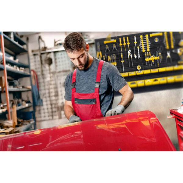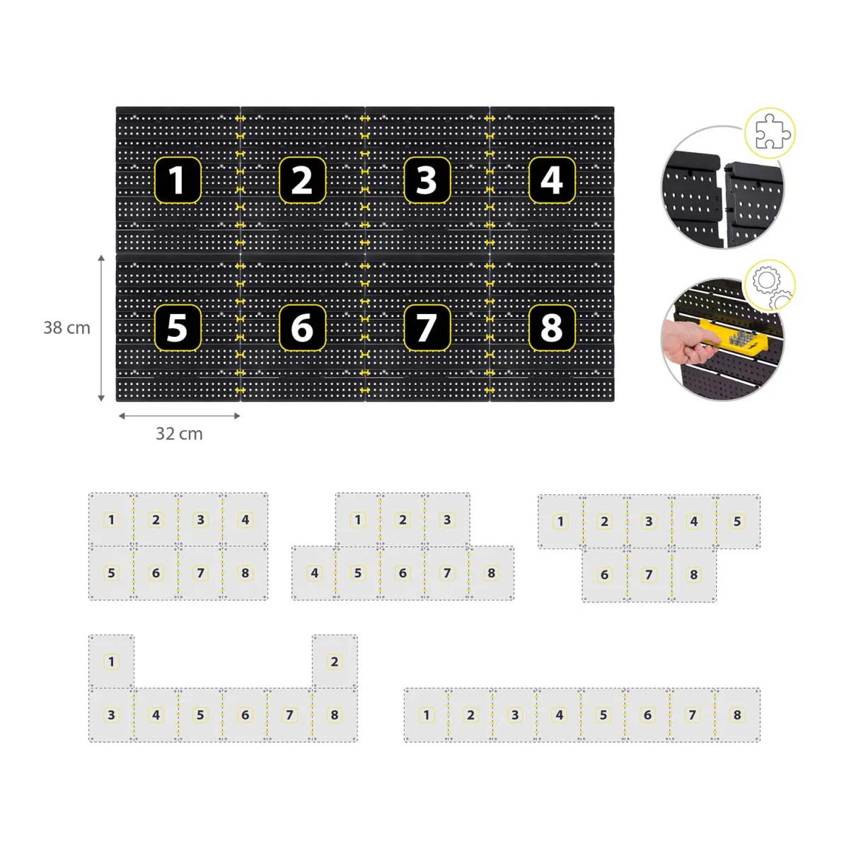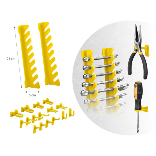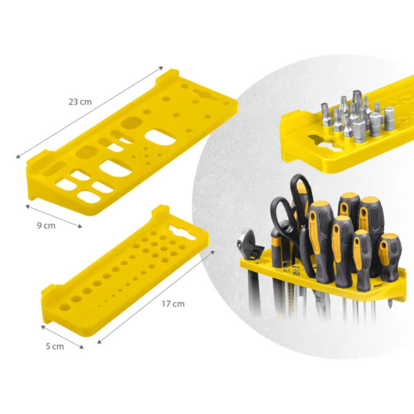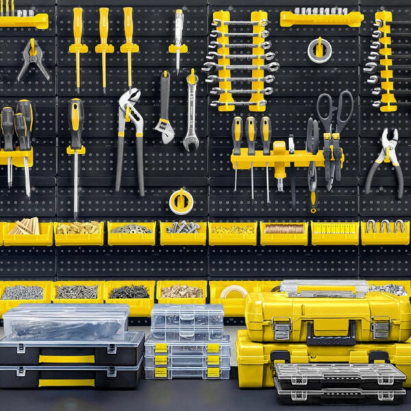 Panoul este format din 6 părți modulare care se conectează într-o singură suprafață. Producătorul a ales materiale punând accent pe durabilitate – componentele din plastic durabil completează baza robustă a panoului. Datorită acestui produs, puteți utiliza eficient peretele pentru a organiza șuruburi, unelte, chei și piese mai mari, în timp ce fiecare piesă de unealtă are propriul loc fix și este întotdeauna la îndemână.