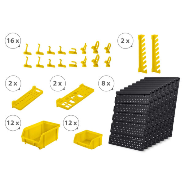 Peretele pentru unelte de atelier HM-580, 128x76cm, galben | Humberg este un panou organizatoric practic care vă va ajuta să vă mențineți atelierul organizat. Setul include până la 54 de accesorii (cuvete, cârlige, rafturi, suporturi), pe care utilizatorul le poate amplasa liber în funcție de propriile nevoi, ceea ce permite un design complet și personalizat al spațiului de lucru.