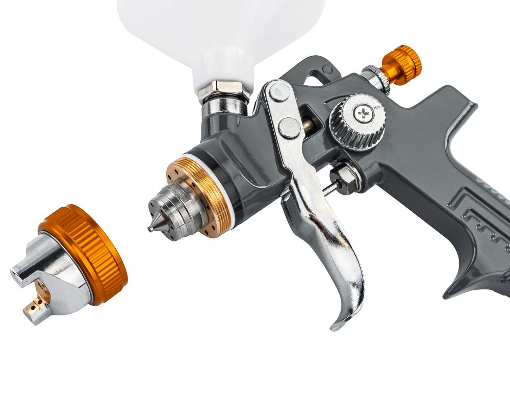 Pistolul de pulverizare obține cele mai bune rezultate la o presiune de lucru de 3-4 bar, ceea ce asigură o pulverizare stabilă și controlată a materialului. Butonul de pe mâner și duza universală de 1,4 mm vă permit să reglați debitul de aer de la compresor. Creșterea volumului de aer îmbunătățește atomizarea și distribuirea vopselei, în timp ce reducerea debitului vă permite să lucrați cu materiale mai dense și pe o suprafață mai mică.