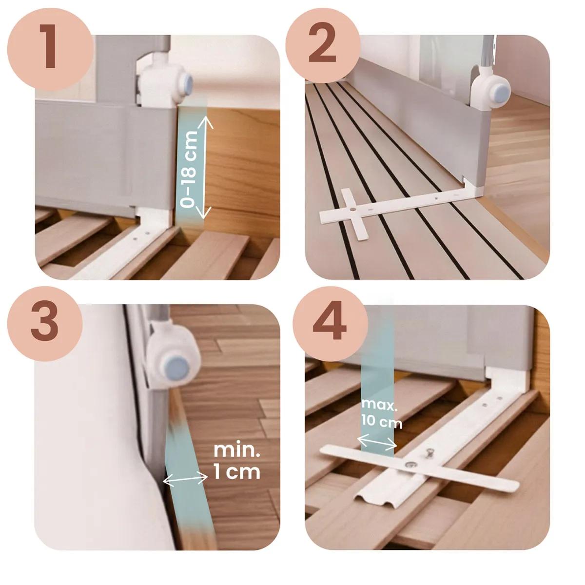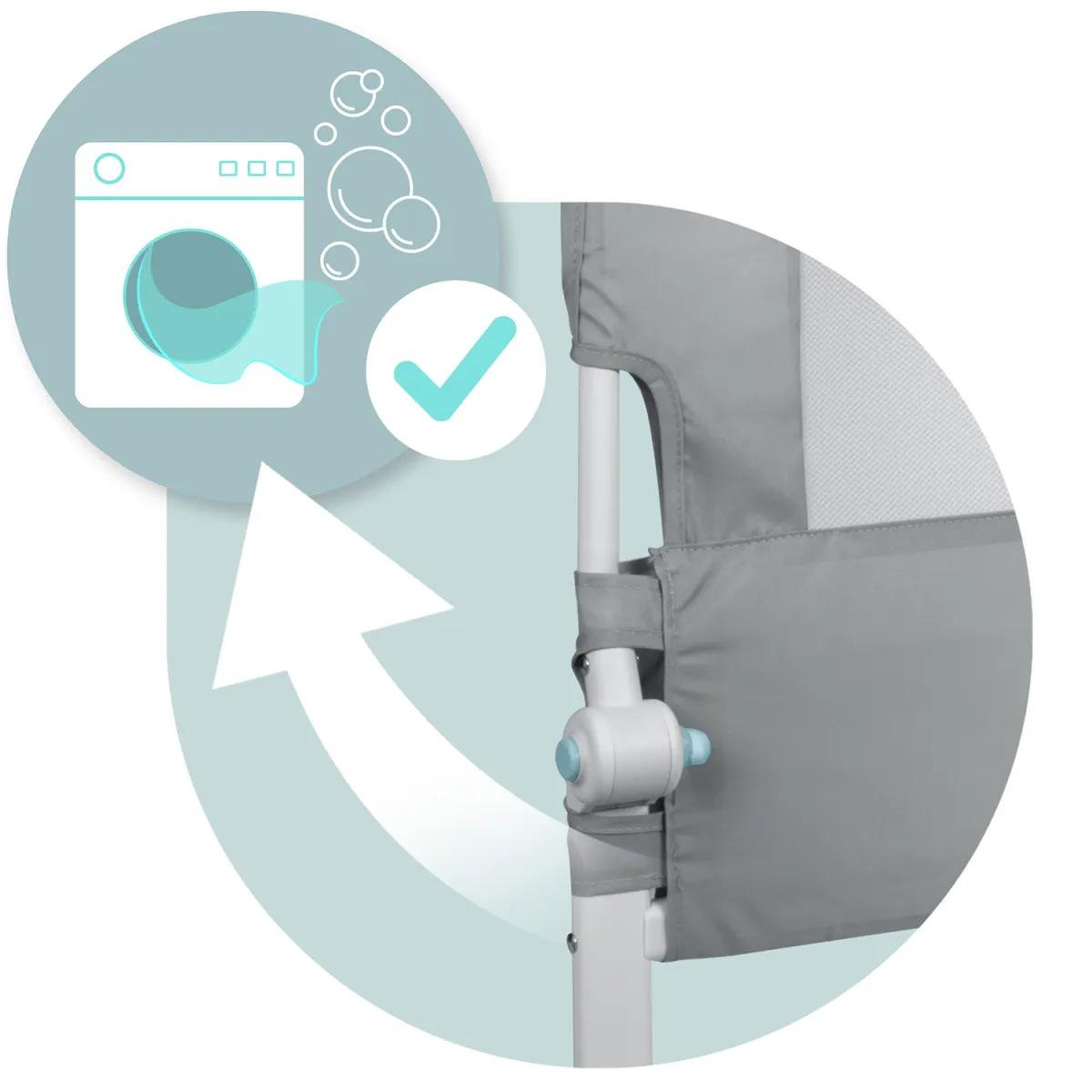 Tapițeria din material textil moale și confortabilă oferă copiilor o senzație plăcută de contact, în timp ce suprafețele ușor de curățat facilitează îngrijirea. Protecția este potrivită pentru paturile pentru copii fără elemente de protecție încorporate și ajută părinții să asigure un somn mai liniștit pentru cei mici.