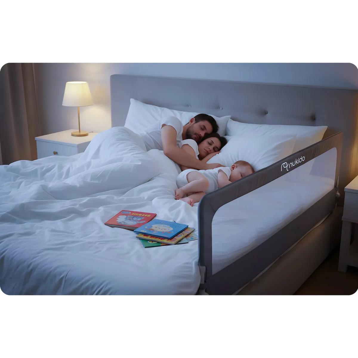 Protej pat NK-228, 200cm, gri | Nukido protejează eficient împotriva căderilor, îi oferă copilului libertate și ție siguranța că este în siguranță. Designul pune accent pe stabilitate și montaj ușor – protecția este fixată ferm pe cadrul patului fără a fi nevoie de unelte complexe, iar materialele durabile asigură o utilizare pe termen lung.