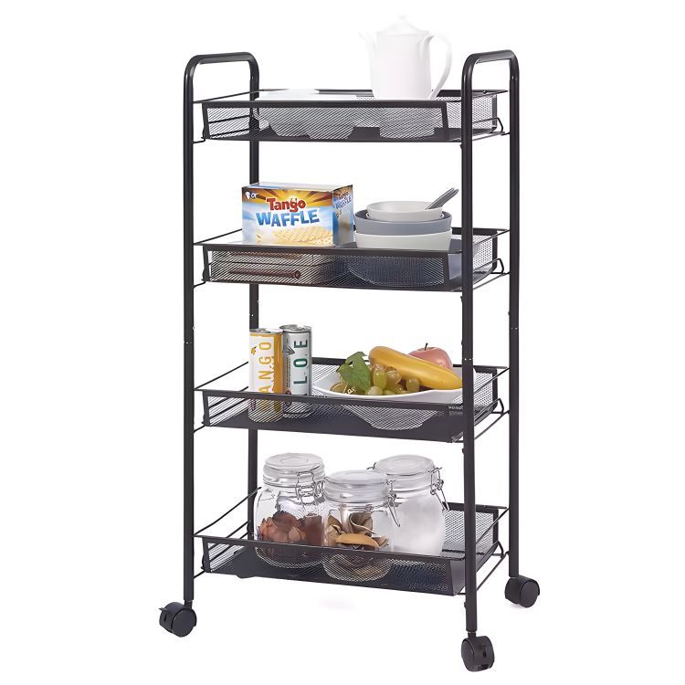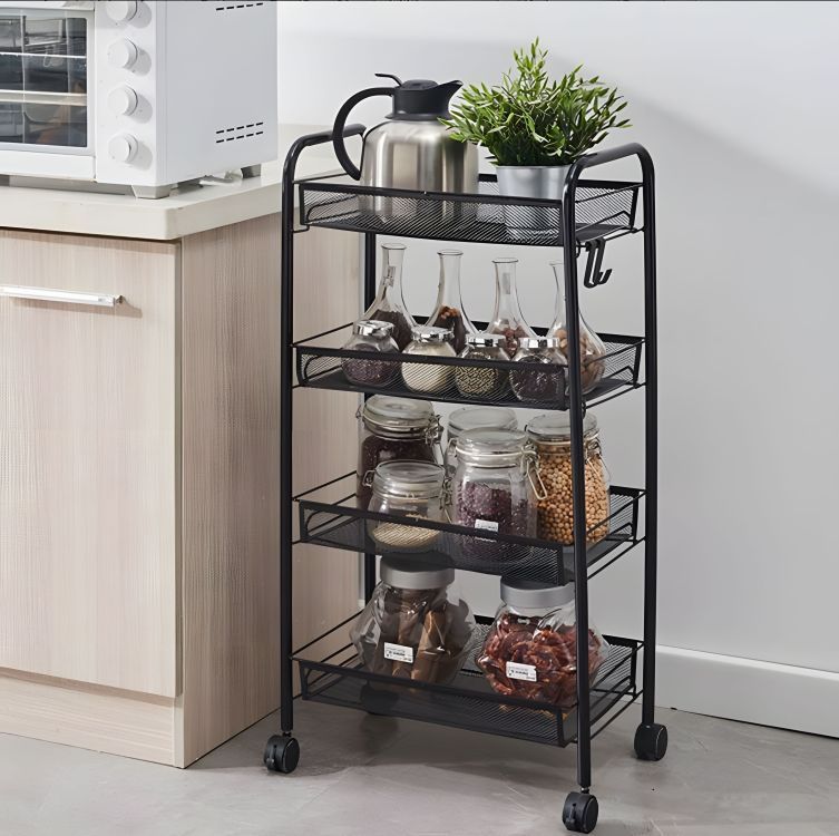 Raft metalic, 4 rafturi, negru | ModernHome oferă o soluție practică de depozitare pentru bucătărie, baie sau alte încăperi, cu posibilitatea de mutare ușoară. Datorită designului său atent, se potrivește cu ușurință în spații înguste și facilitează accesul la cele mai necesare lucruri. Raftul va impresiona nu numai prin funcționalitatea sa, ci și ca element decorativ elegant, care adaugă caracter și eleganță interiorului.