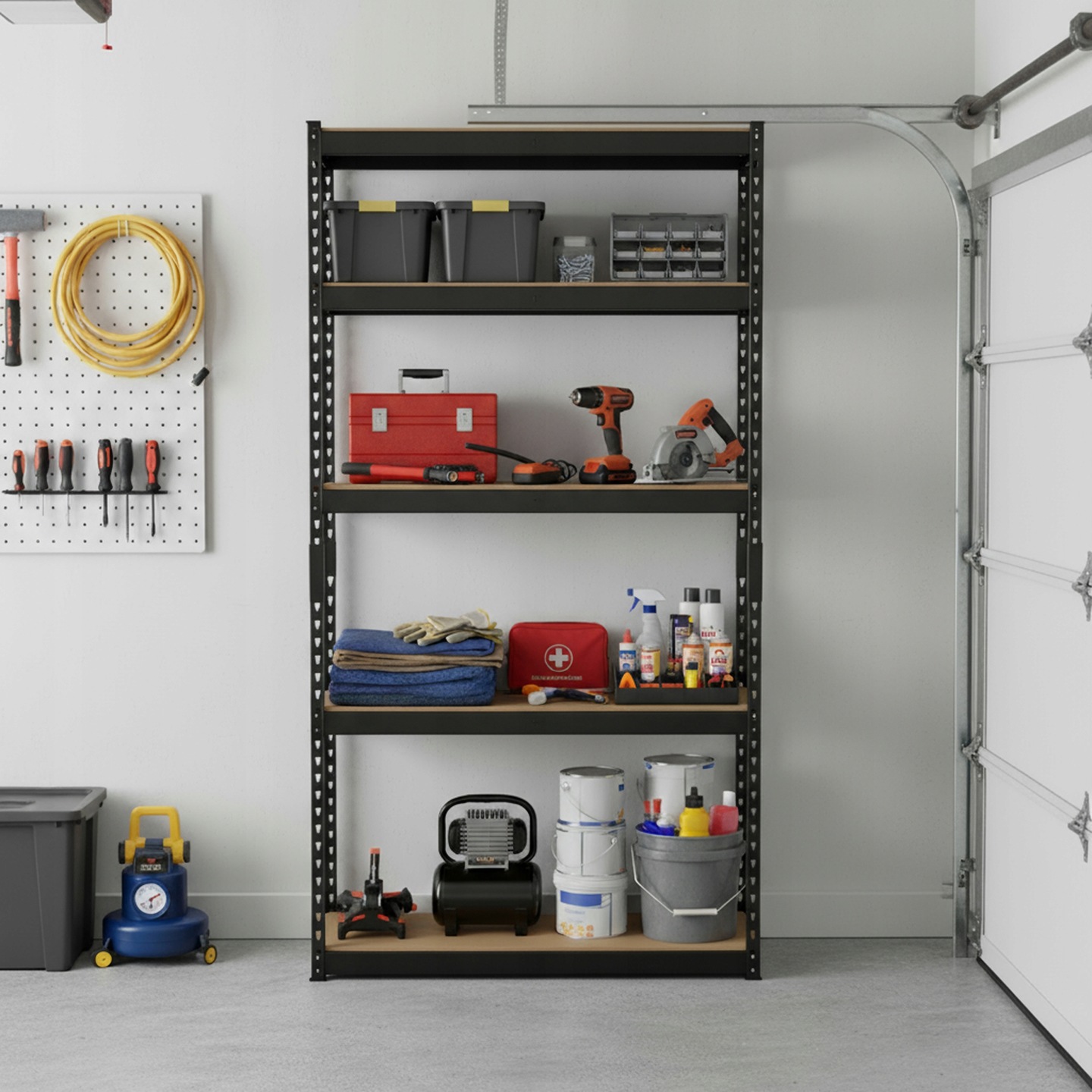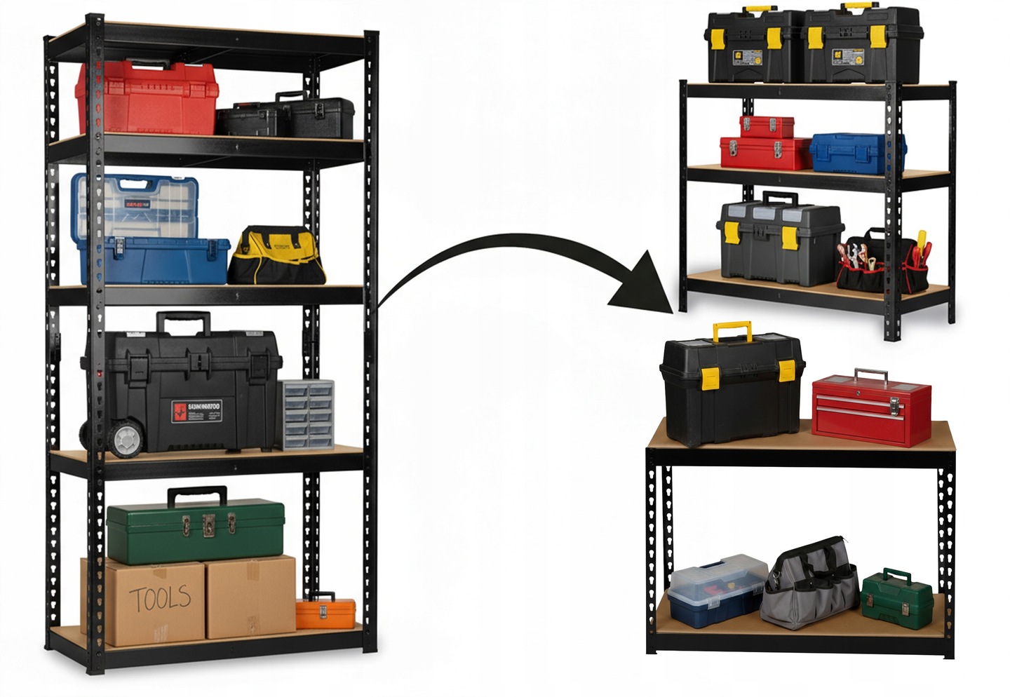 Ocupă puțin spațiu, dar datorită rafturilor sale oferă mult spațiu de depozitare. Raftul este format din 5 rafturi pe care puteți așeza produse, cutii sau echipamente cu o sarcină maximă de 265 kg pe raft. Un alt avantaj al acestui raft este că poate fi împărțit în două unități mai mici.