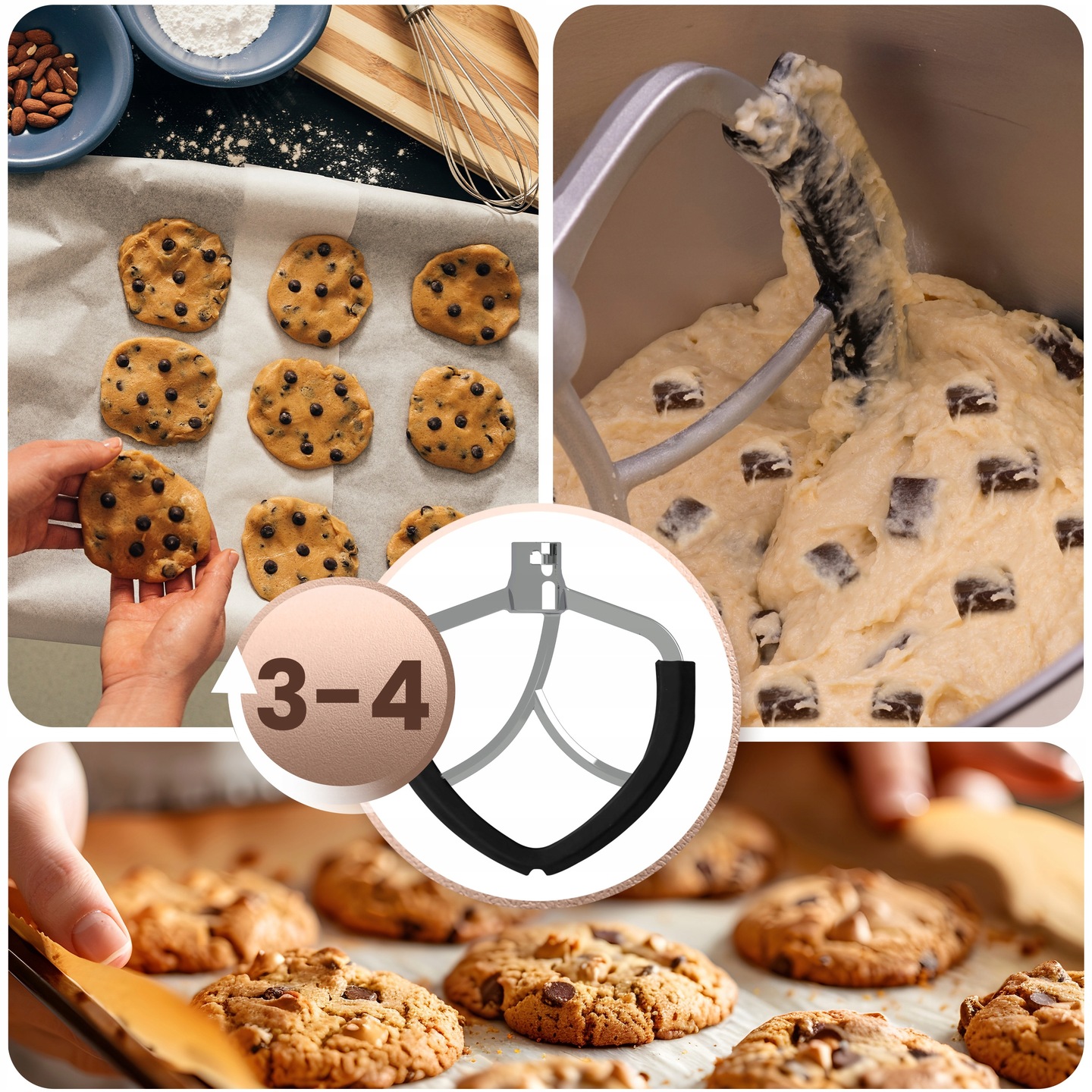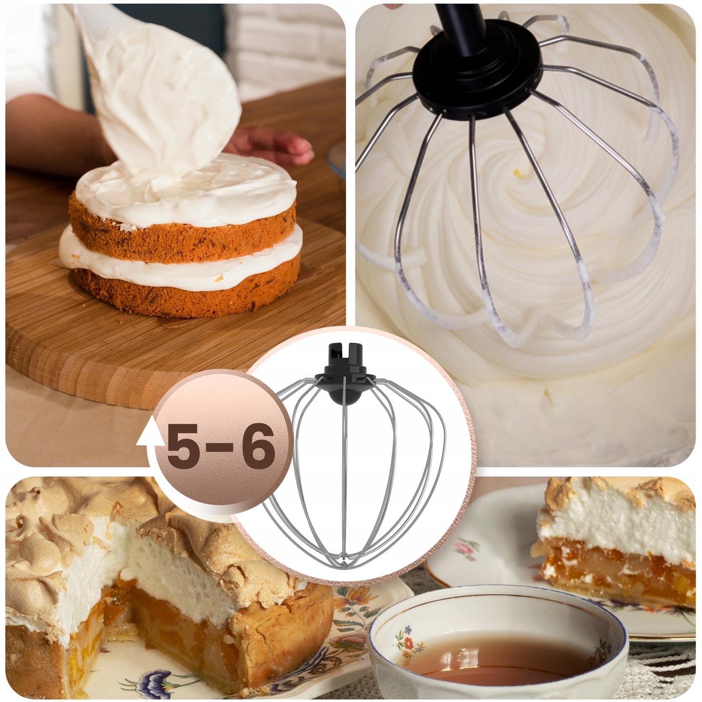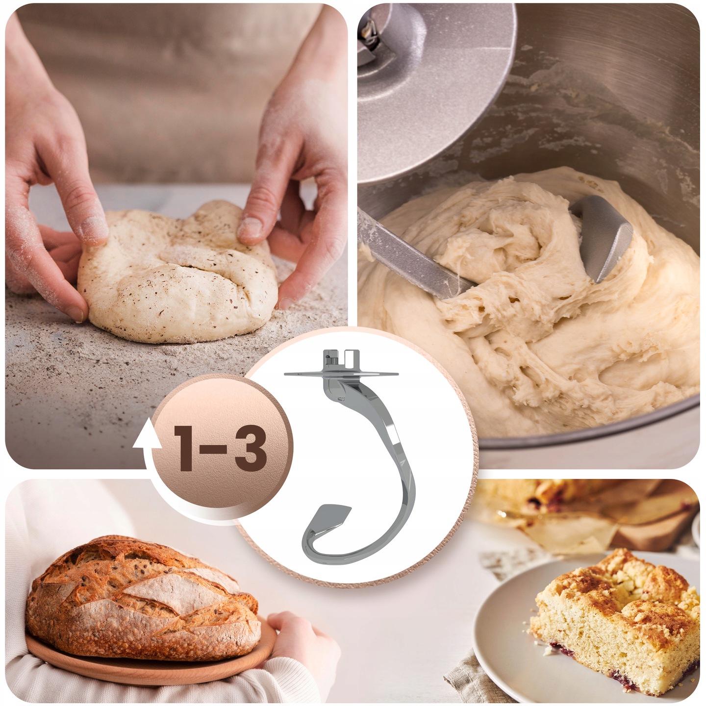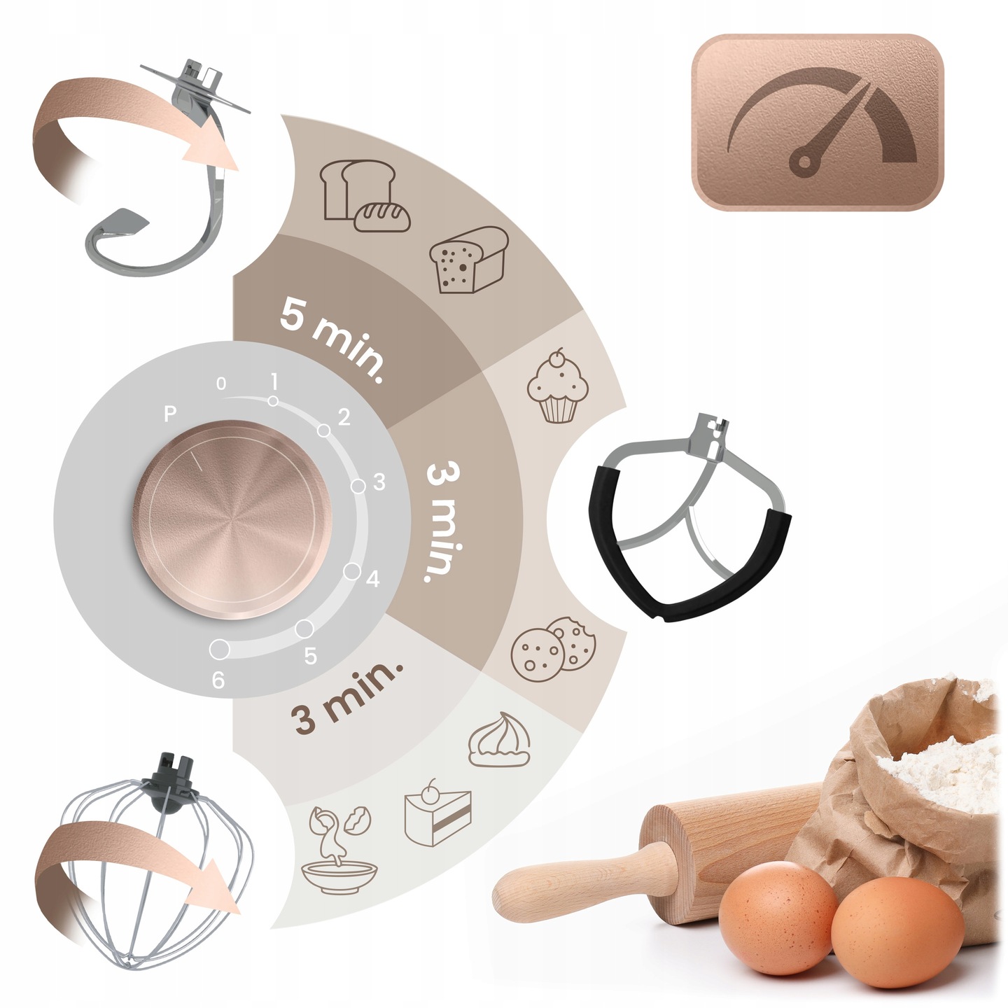 Pachetul include mai multe accesorii (cârlig pentru aluat, mixer, tel), astfel încât robotul poate gestiona orice, de la aluat de drojdie sau pâine la creme și frișcă pufoasă. Fiecare accesoriu are un scop diferit – viteza ideală, rezultatul perfect. Cârligul pentru aluat funcționează cel mai bine la vitezele 1-3, mixerul pentru frișcă și umplutură funcționează cel mai bine la setările 2-4, iar telul pentru spumă și frișcă își atinge potențialul maxim la vitezele 5-6 – întotdeauna cu consistența perfectă.