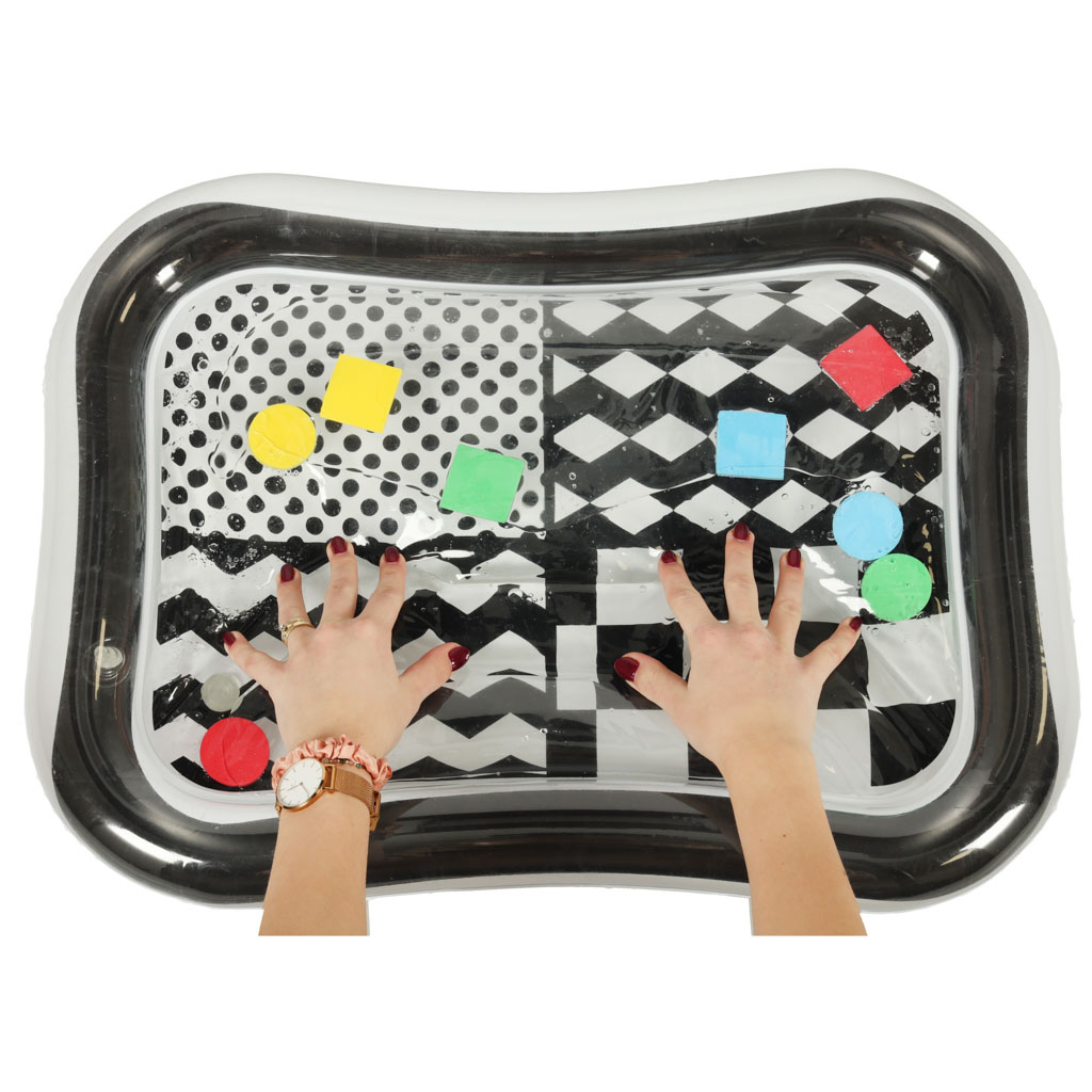 Salteaua de apă pentru copii, 65x50cm | alb-negru este o saltea senzorială gonflabilă cu elemente contrastante, care va fi o jucărie ideală pentru cei mici. Se folosește pentru a fi umplut cu apă și susține joaca distractivă pentru cei mai mici copii. Formele geometrice colorate din interiorul saltelei atrag atenția copiilor mici și îi motivează să fie activi. Jucăria dezvoltă abilități manuale și intelectuale și îi ajută pe copii să recunoască culorile și formele geometrice.