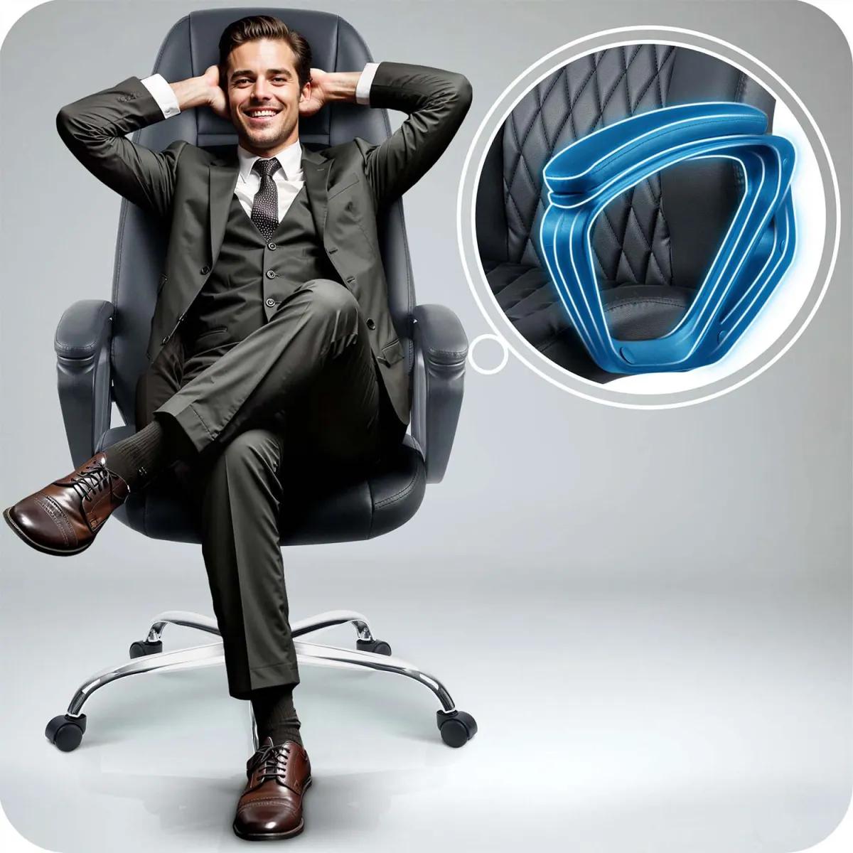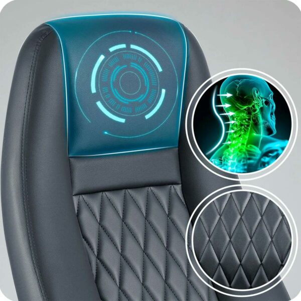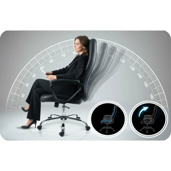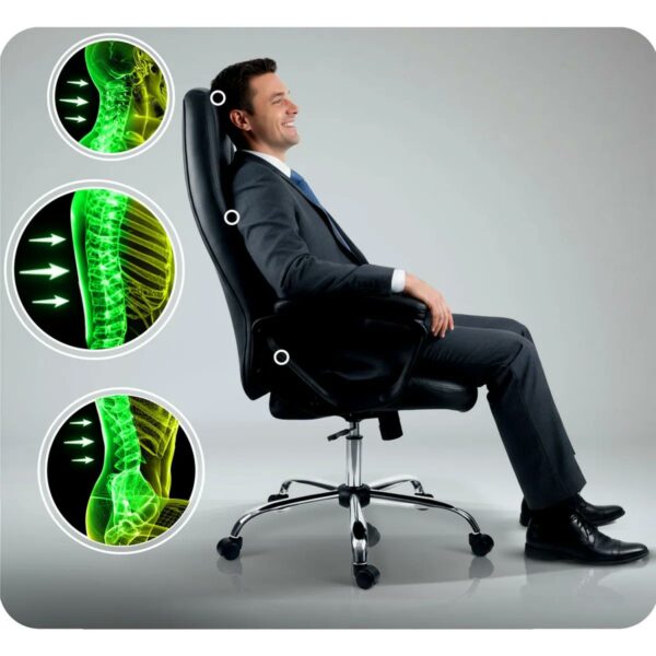 Scaunul oferă o gamă largă de înclinare a spătarului, astfel încât să puteți trece oricând de la o poziție de lucru la o poziție confortabilă de odihnă. Suportul lombar conturat ajută la menținerea unei poziții corporale ergonomice și sigure. Tetiera conturată distribuie uniform presiunea, ameliorează mușchii și previne durerile de gât. Rama din oțel cromat de înaltă calitate asigură o stabilitate și o durabilitate excepționale, iar finisajul elegant este rezistent la zgârieturi și coroziune.