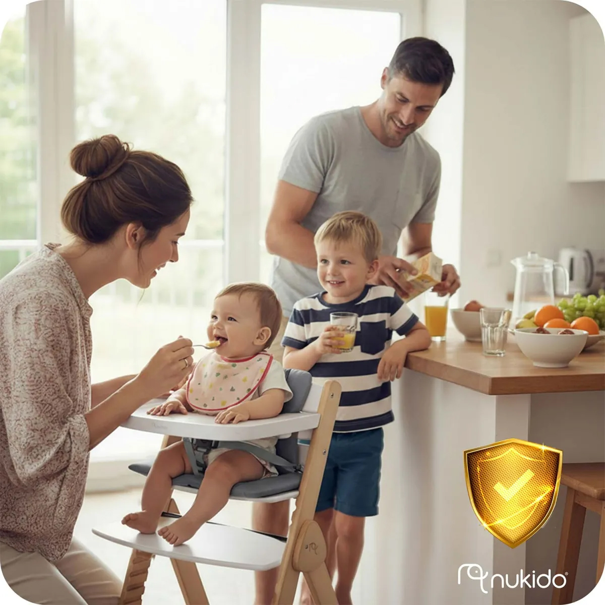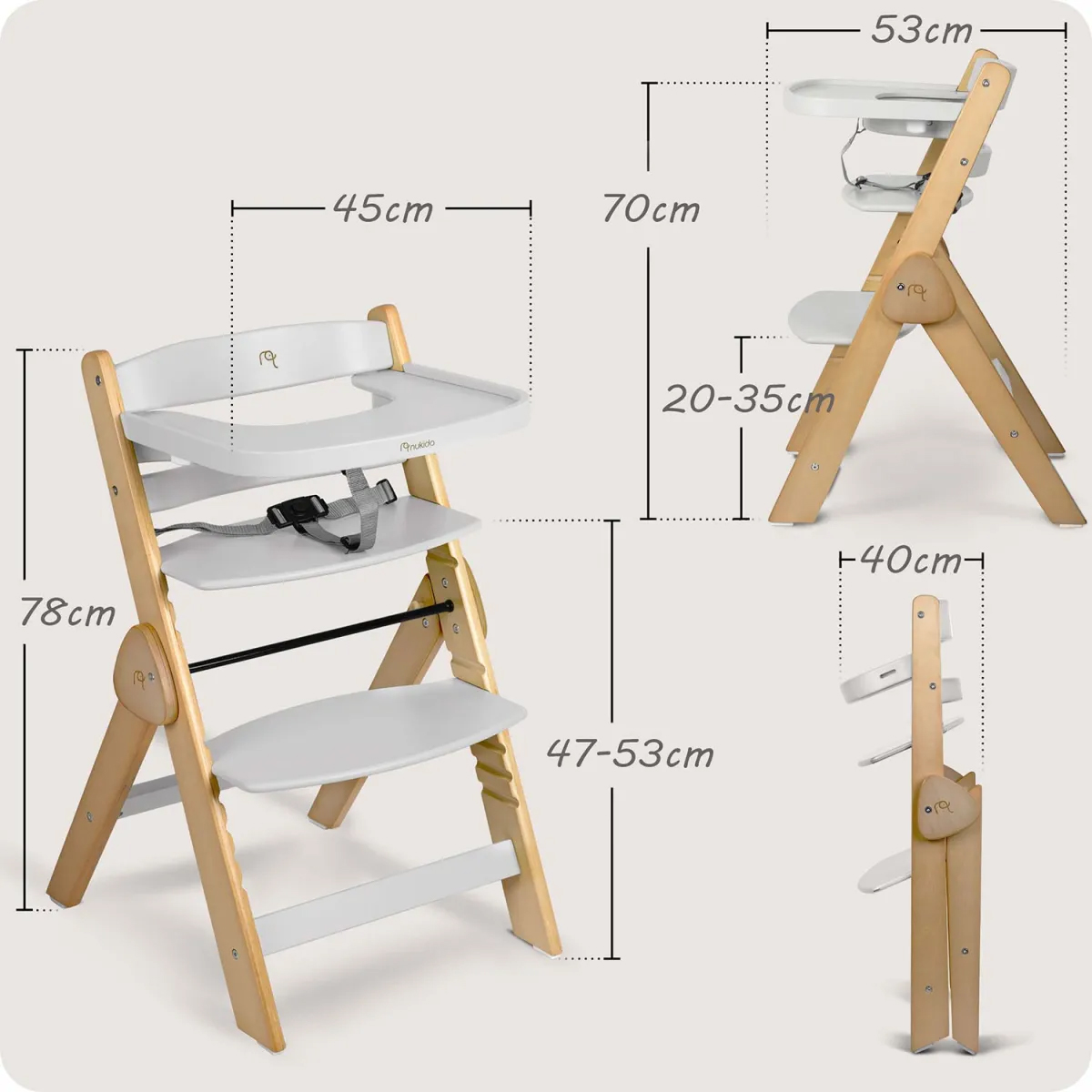 Scaunul de masă pentru copii Timo 2-în-1, alb | Nukido este un scaun de hrănire stabil și sigur, care susține o poziție confortabilă și independentă la masă. Datorită unui set special de centuri de siguranță și unei perne confortabile, devine un prim scaun sigur și confortabil pentru copilul dumneavoastră. Ideal pentru primele mese și momentele petrecute împreună la masă. Dacă copilul dumneavoastră crește, pur și simplu scoateți tava și reglați înălțimea șezutului și a suporturilor pentru picioare.