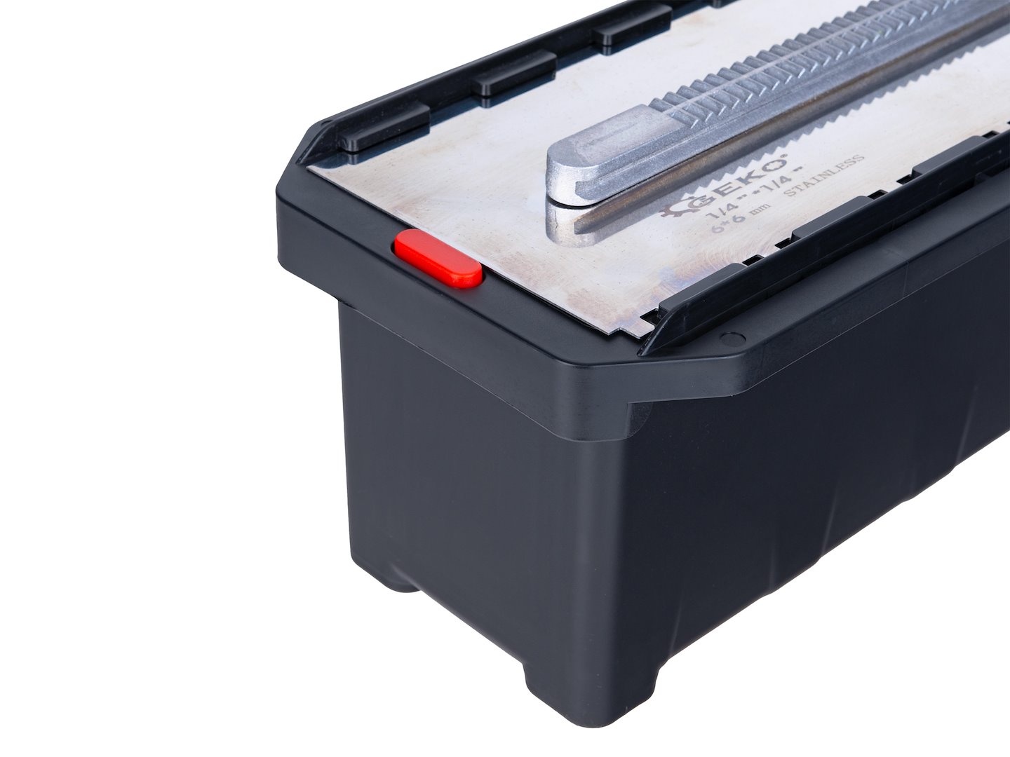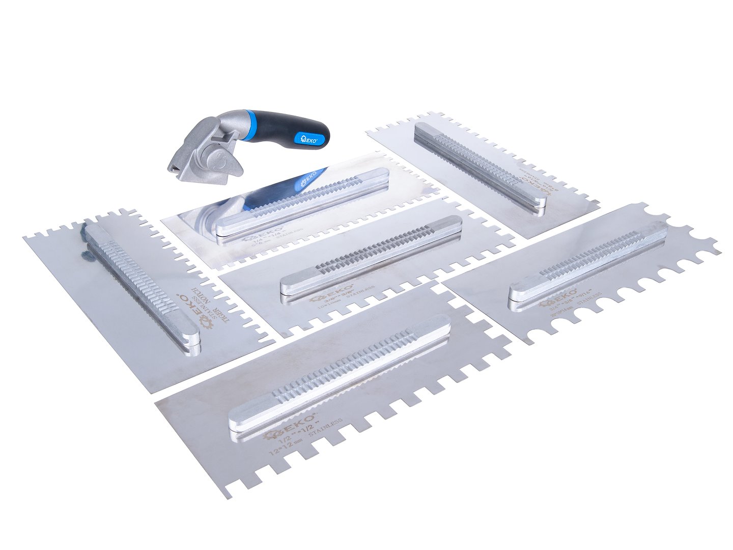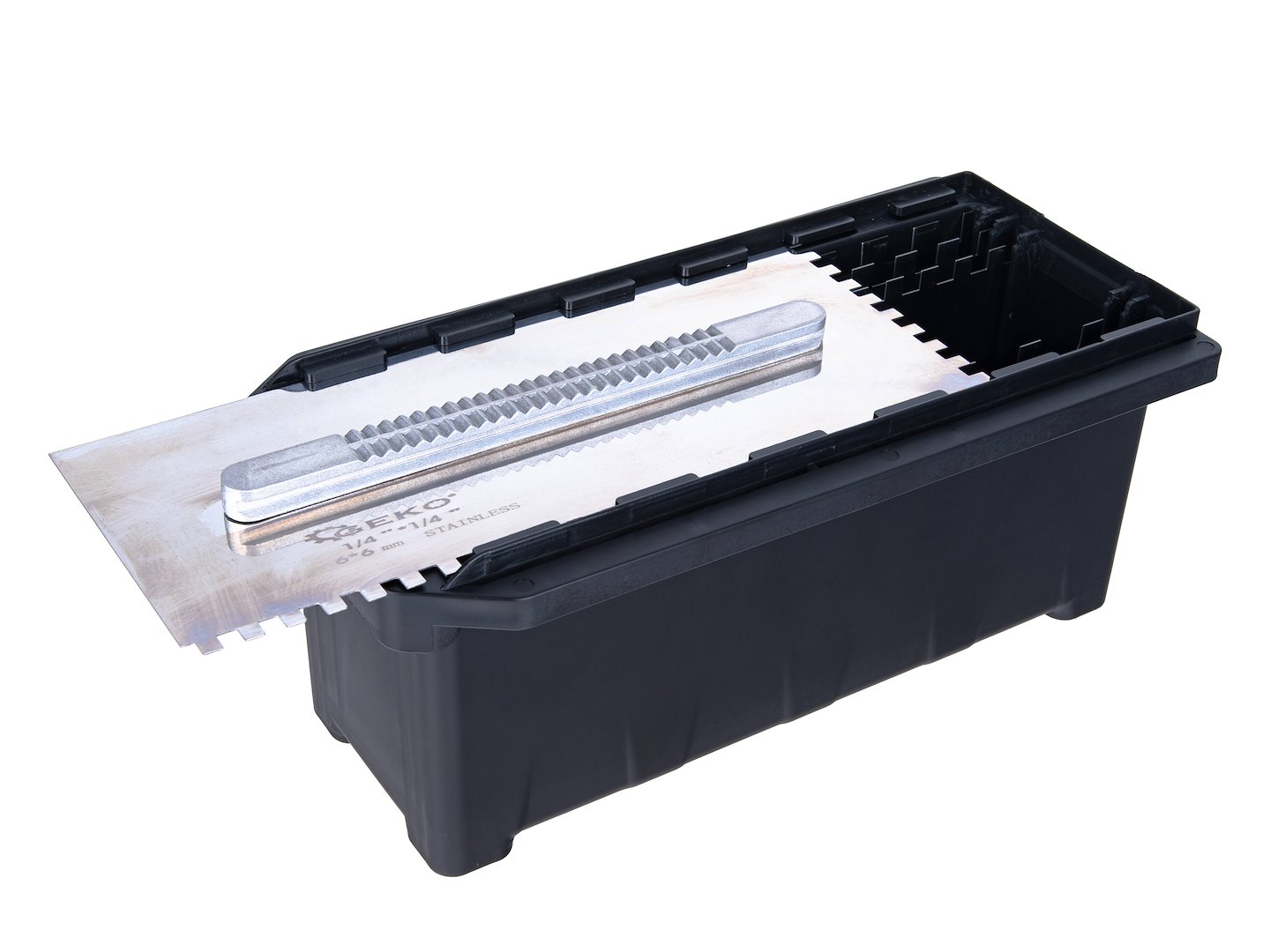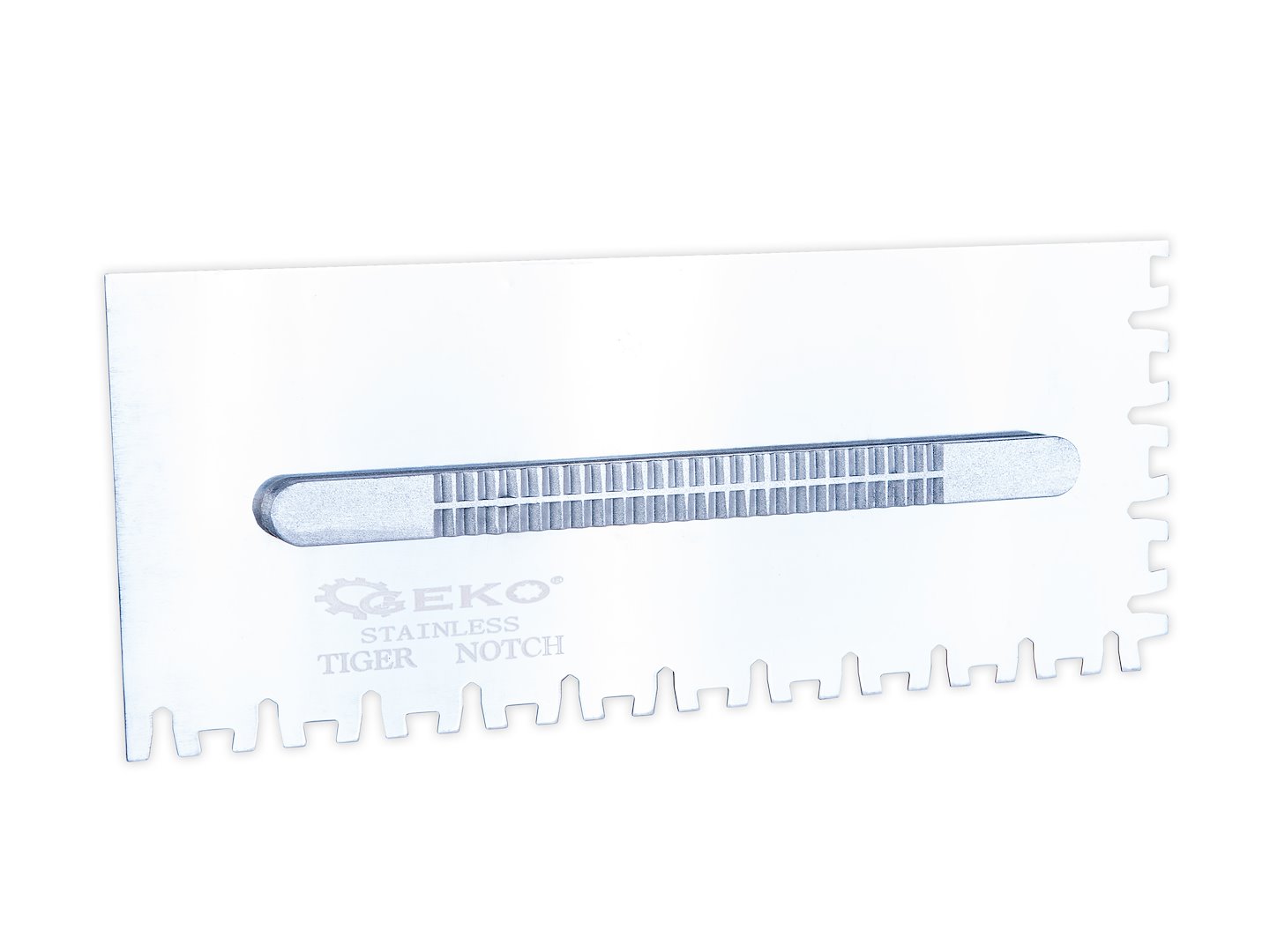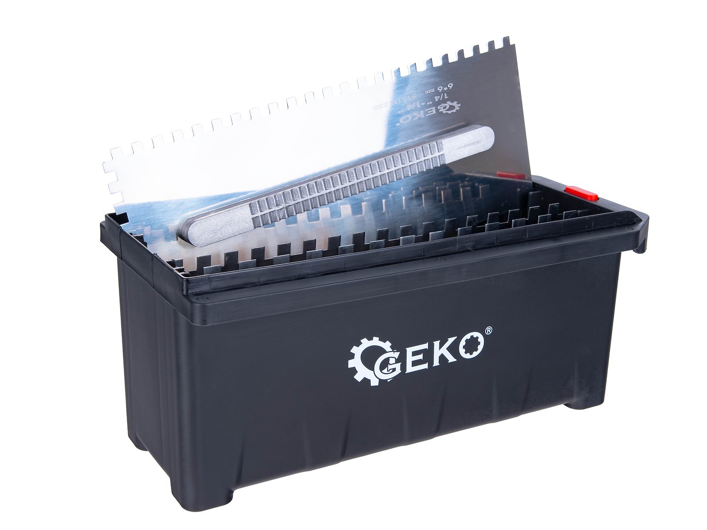Set de aplicare adeziv pentru faianță, 280x115mm | GEKO conține uneltele necesare care simplifică munca zilnică a unui montator de faianță. Setul include 6 piepteni interschimbabili cu diferite tipuri de dinți, un mâner cu eliberare rapidă și o cutie practică de transport. Fiecare mistrie are dimensiunile de 280 x 115 mm, ceea ce le face ideale atât pentru suprafețe mai mari, cât și pentru cele mai mici.